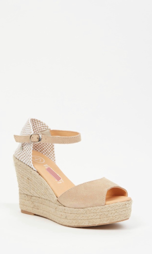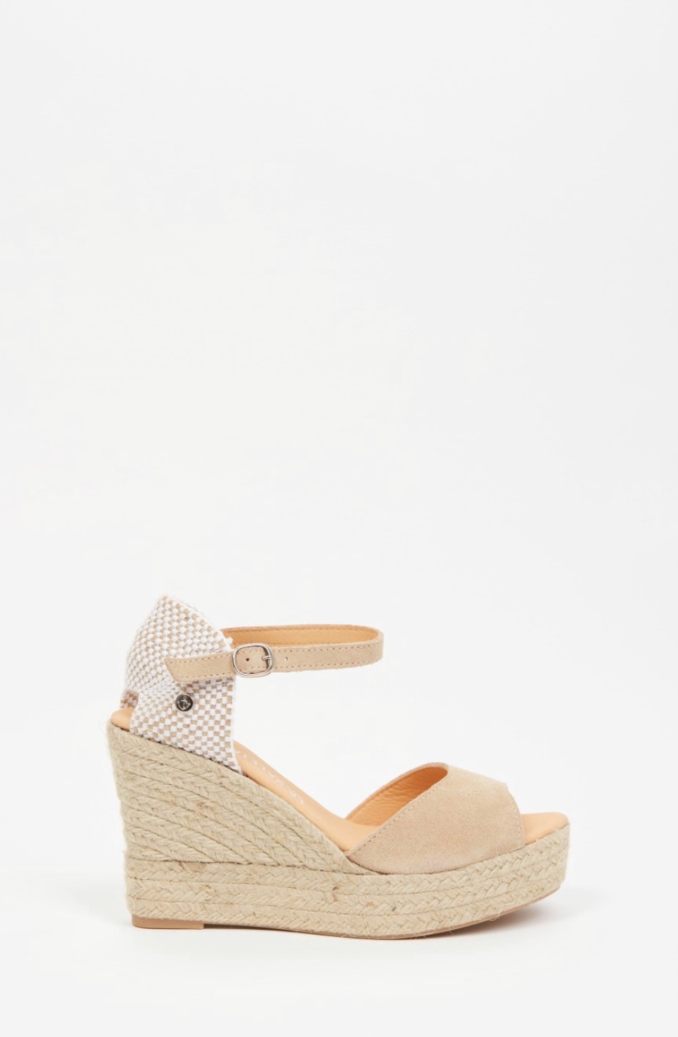 Alpargatas de mujer  hechas en piel color maquillaje. Estas cuñas están hechas a mano por artesanos españoles, y tienen una suela de yute natural con una cuña de 10 cm.