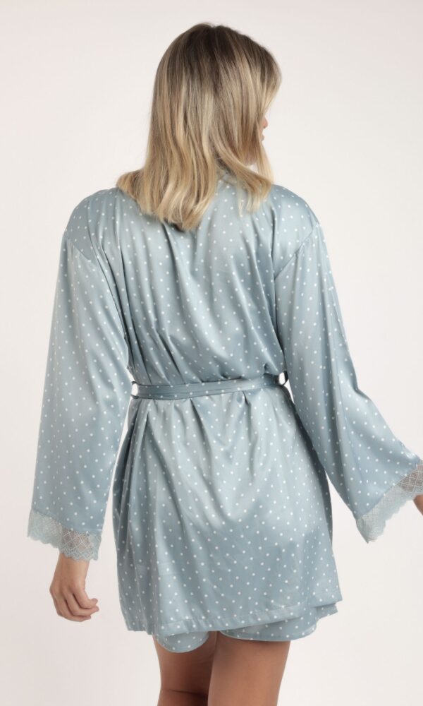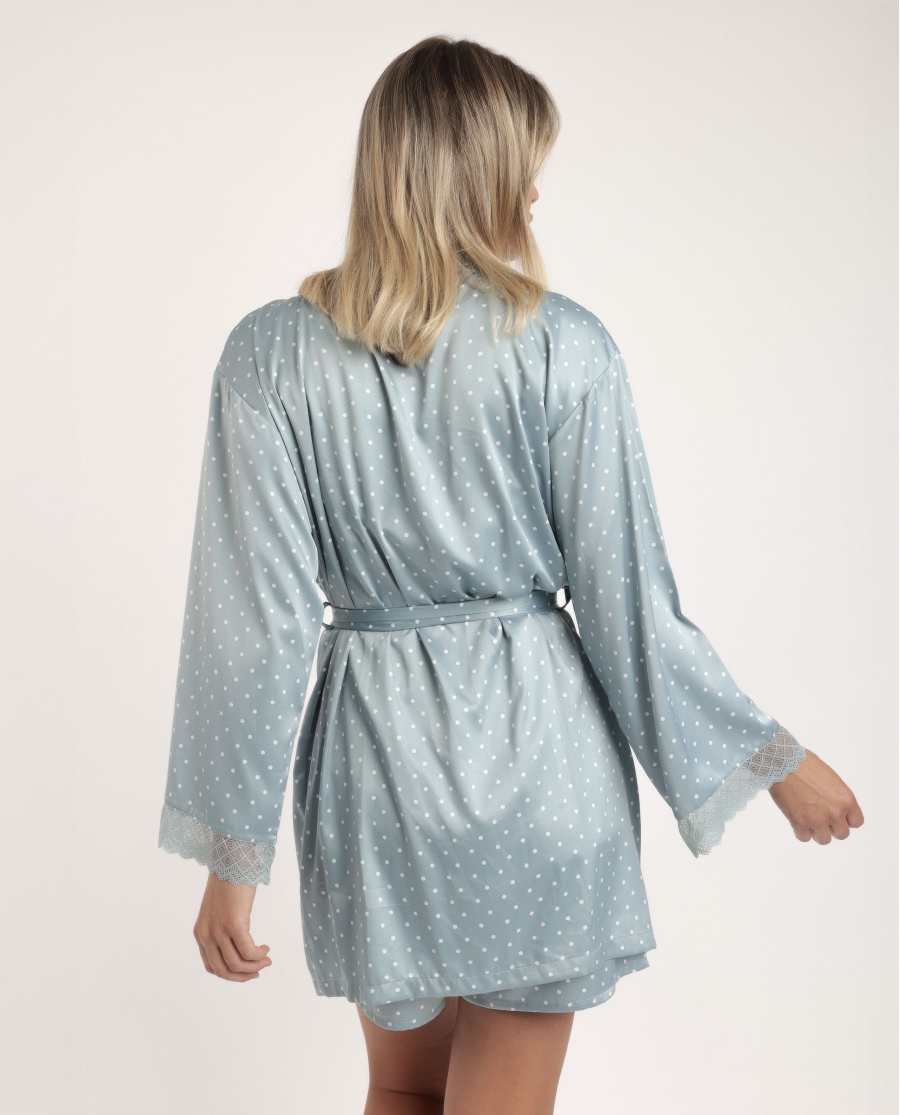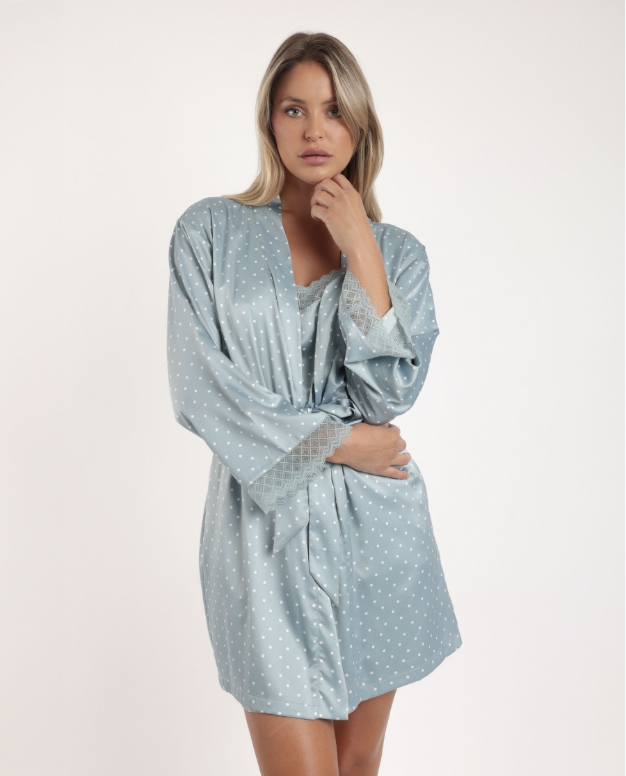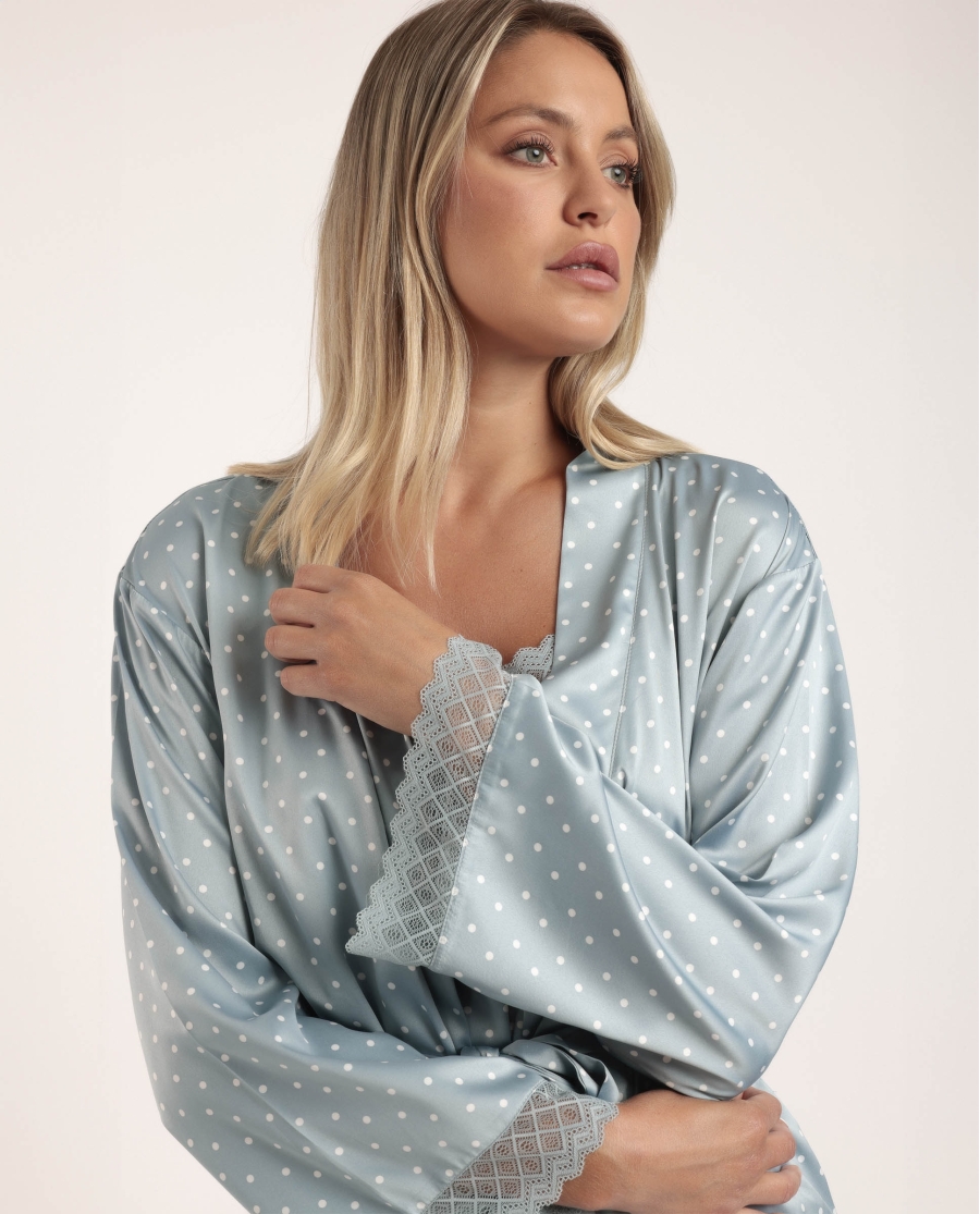 Disfruta de nuestra bata de satén en color piedra, una prenda elegante con manga larga y delicados detalles de puntilla lencera en las mangas. Su tejido suave al tacto y el cinturón a juego garantizan comodidad y un ajuste perfecto, ideal para aportar un toque sofisticado a tus momentos de descanso.