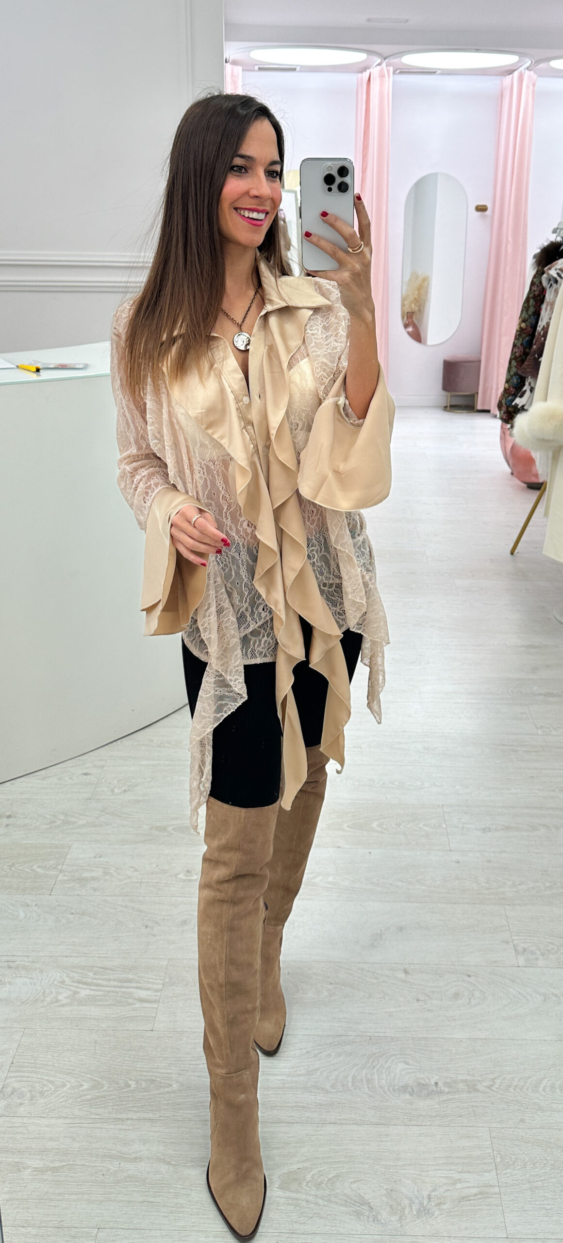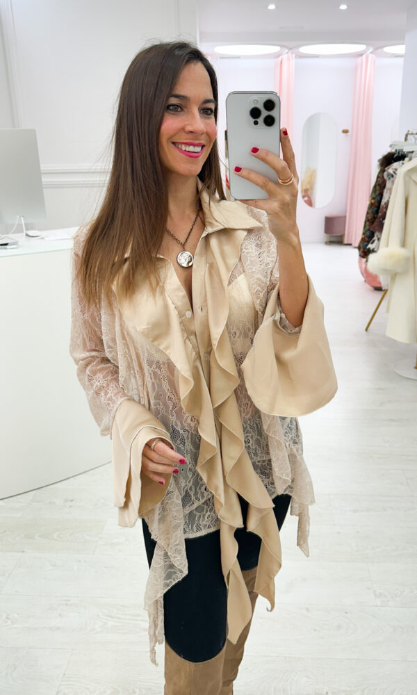 Camisa elegante de encaje y satén, con volantes y botones centrales. Perfecta para dar un toque de sofisticación a tus looks.