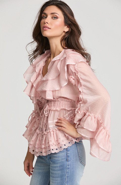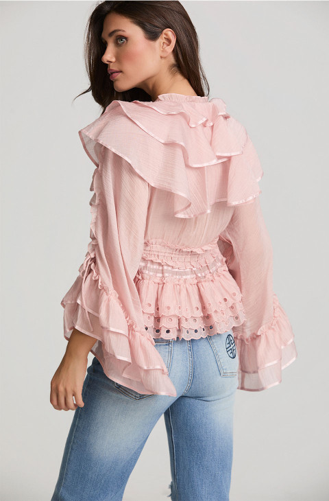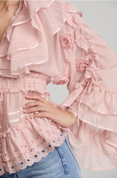 - Blusa rosa con volantes, bordados florales y mangas abullonadas