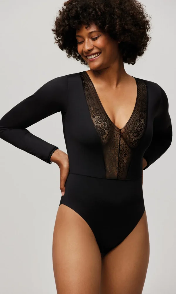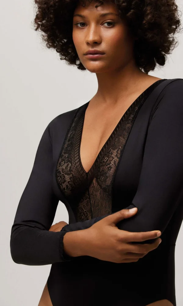 El toque distintivo de elegancia de este body se encuentra en la delicada decoración de encaje que adorna la zona del escote y las mangas. Este encaje aporta un toque sofisticado y romántico, realzando tu feminidad y añadiendo un toque sensual a tu atuendo.