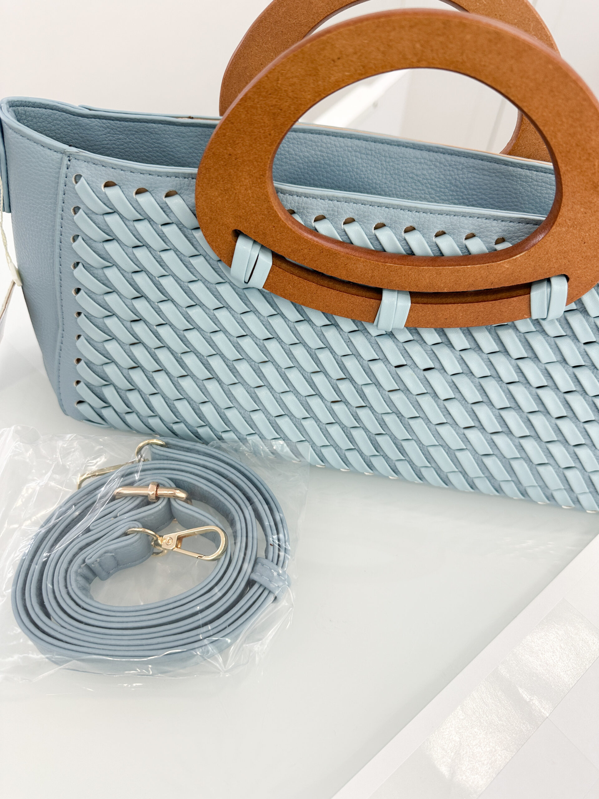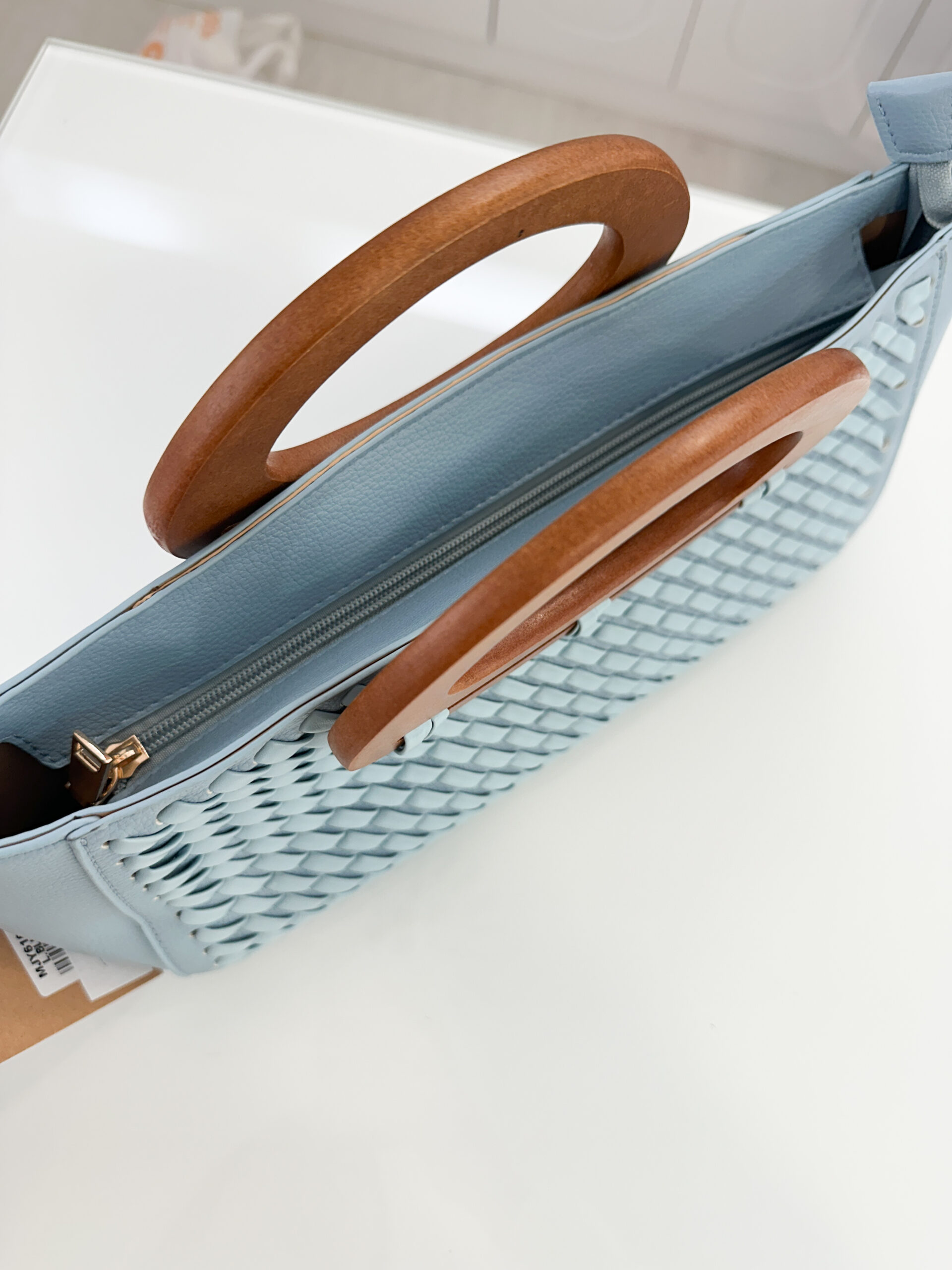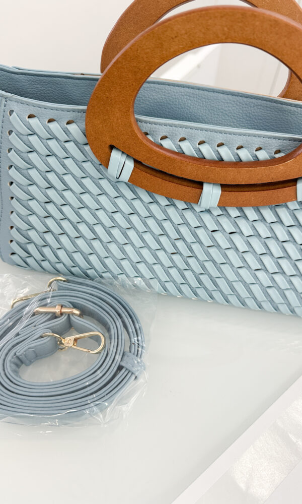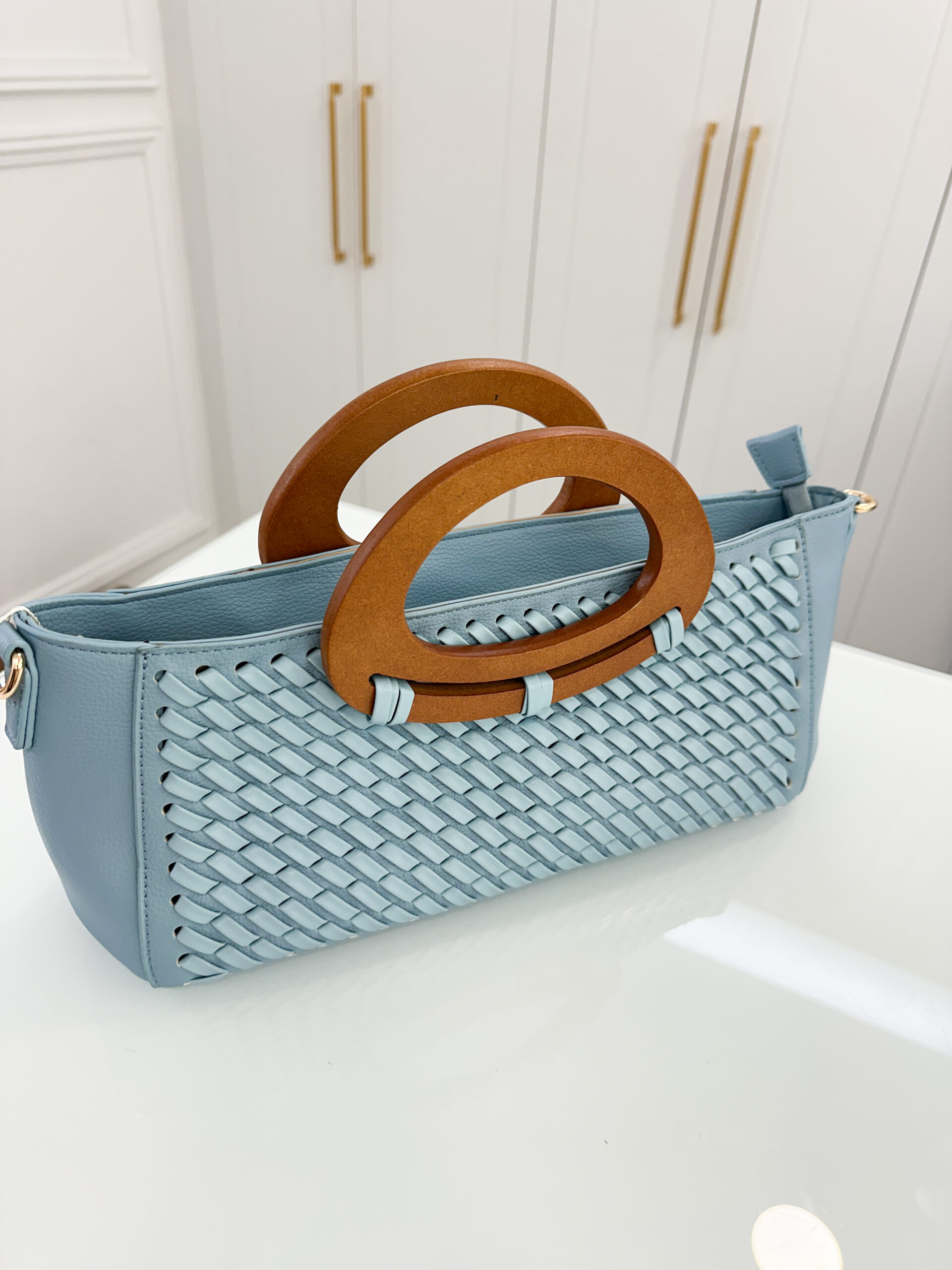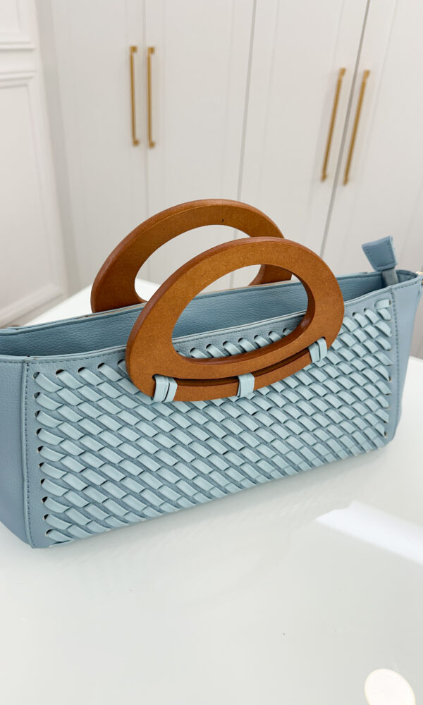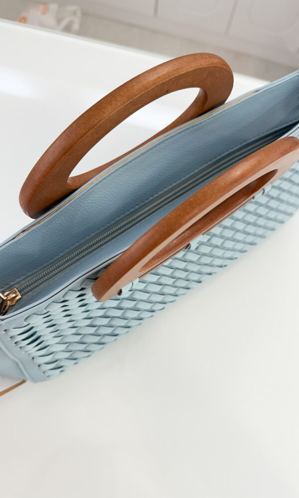 Bolso en color azul con asas en madera, su cuerpo presenta un delicado entramado trenzado que aporta textura y un aire sofisticado, mientras que su tono azul claro transmite frescura y versatilidad.
