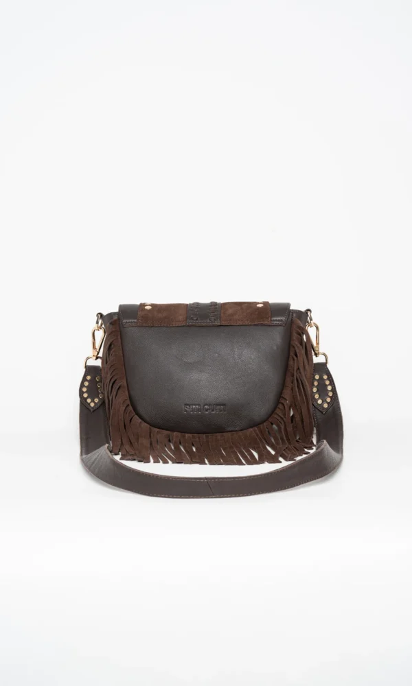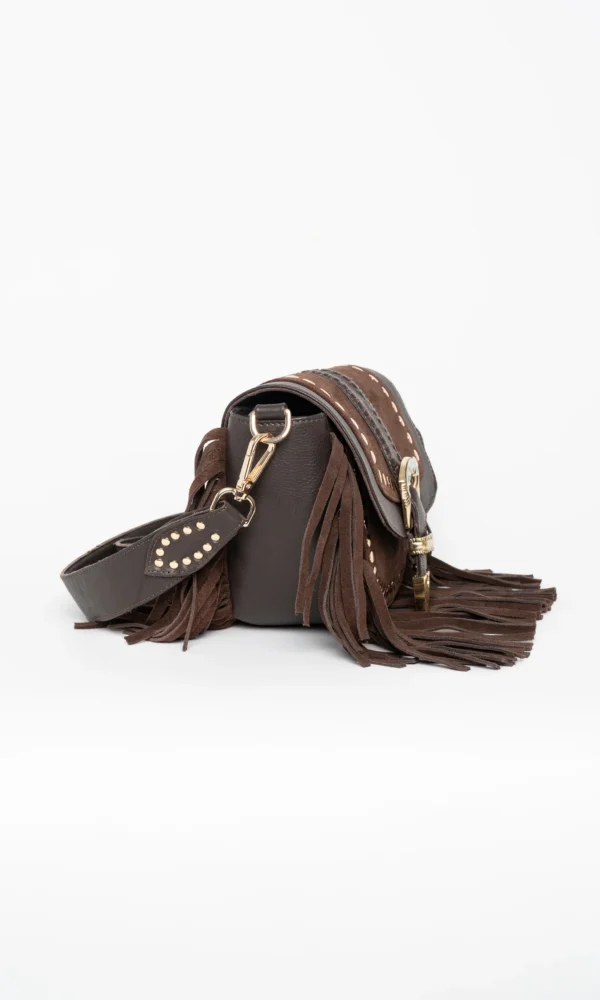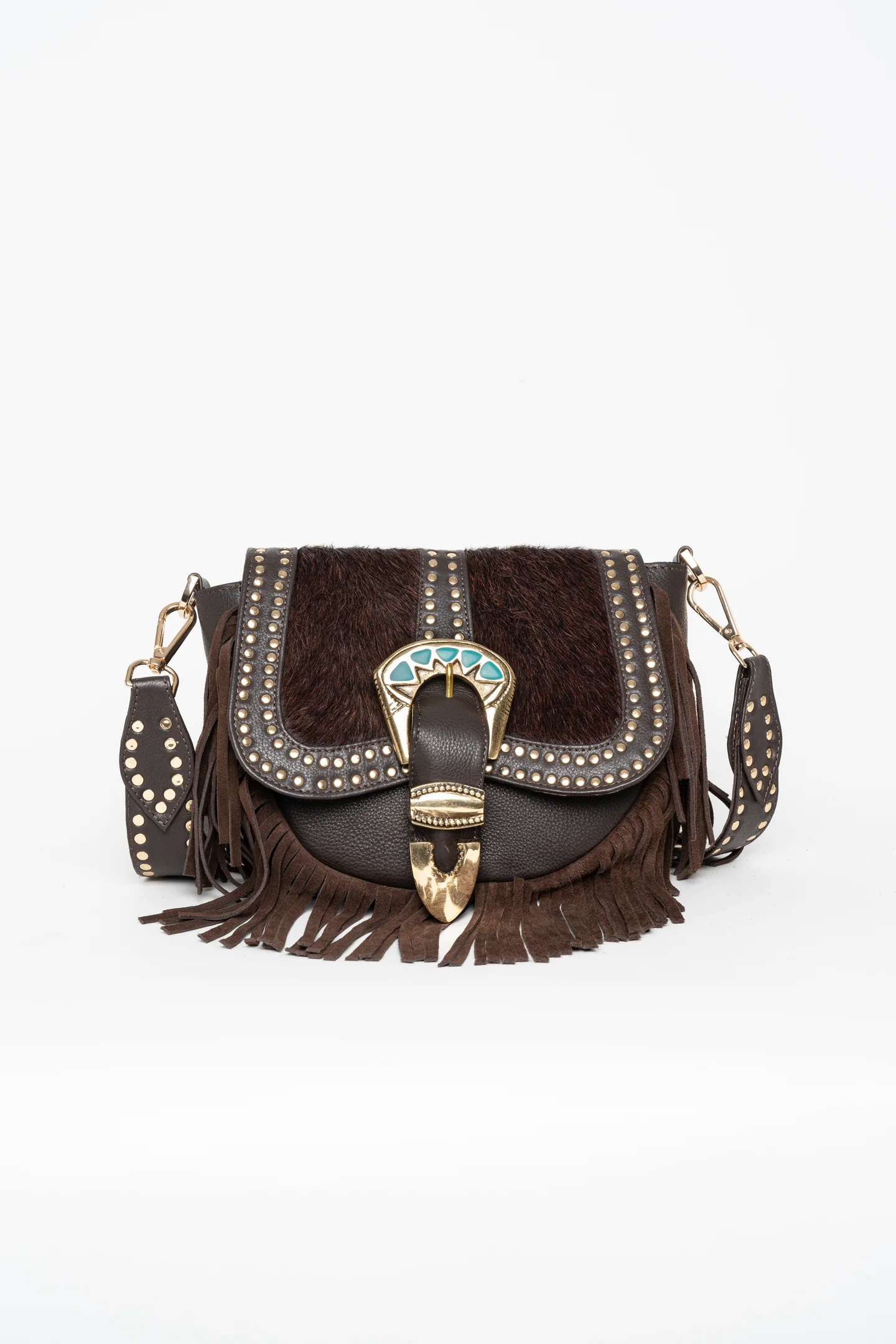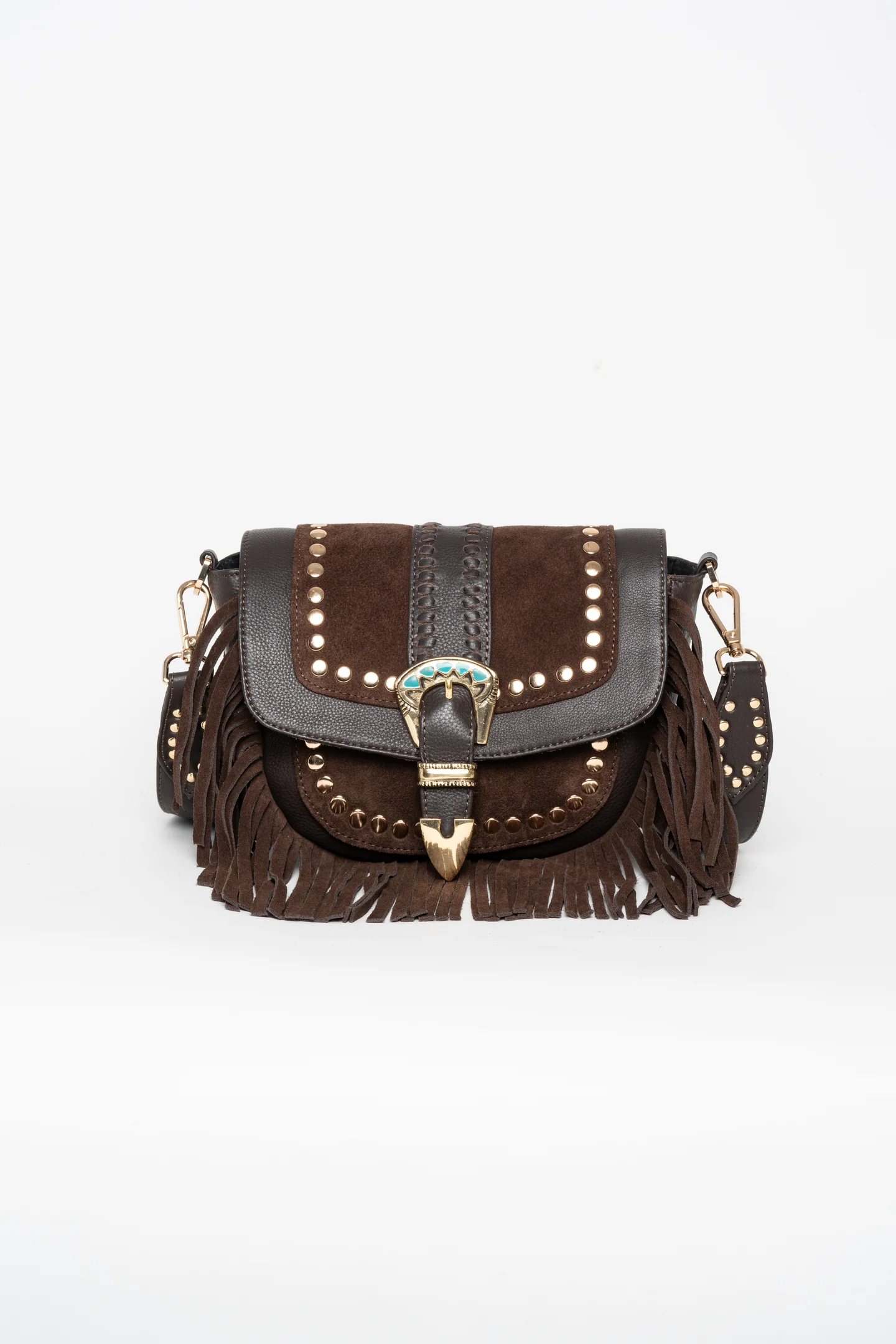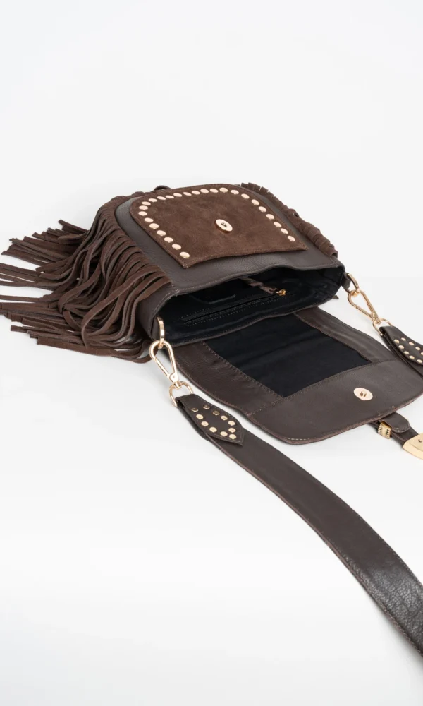 Añade un toque bohemio a tu look con este bolso bandolera de cuero. Con su diseño de flecos en la solapa y los laterales, y los detalles de tachuelas doradas, es el accesorio perfecto para la mujer que busca una pieza diferente y con carácter. La hebilla metálica con relieve le da un toque distintivo. Ideal para llevar lo esencial con estilo en tus salidas de día o noche.