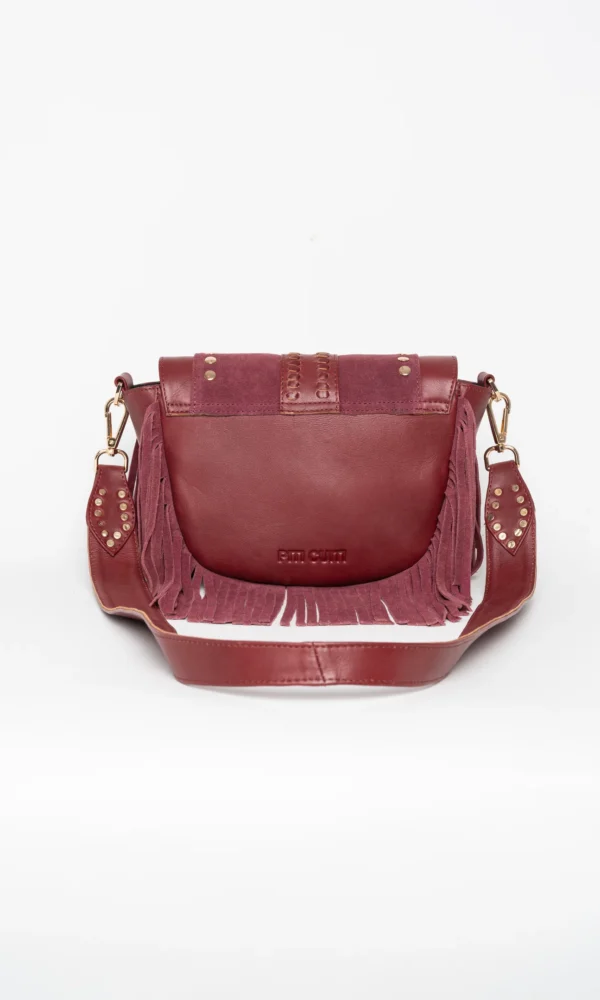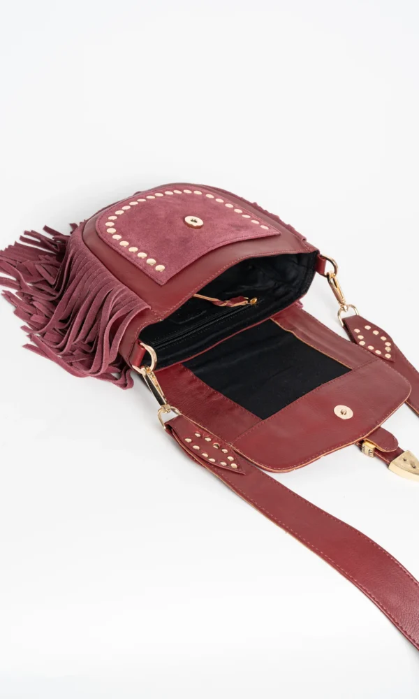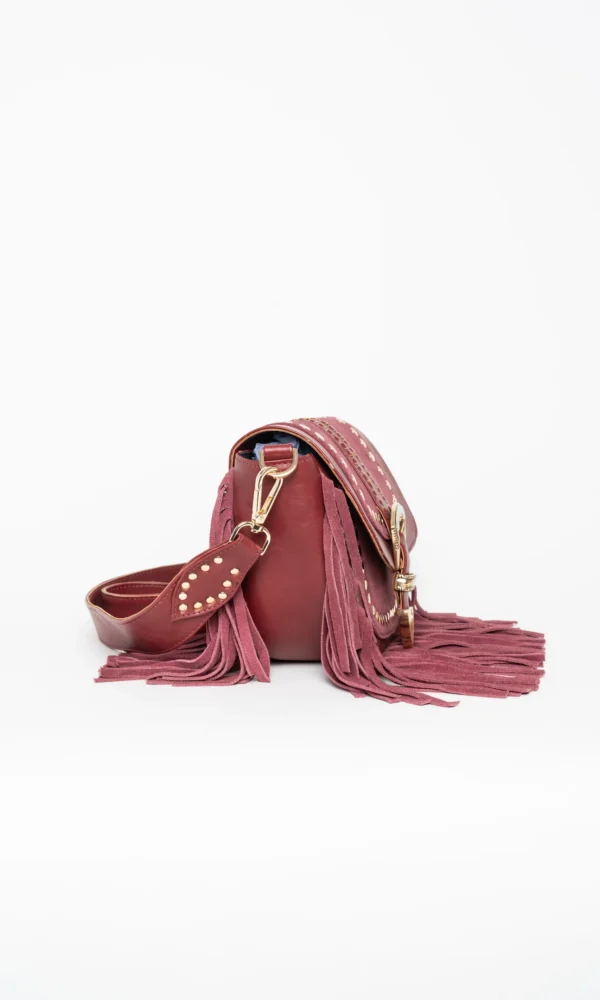 Añade un toque bohemio a tu look con este bolso bandolera de cuero color granate. Con su diseño de flecos en la solapa y los laterales, y los detalles de tachuelas doradas, es el accesorio perfecto para la mujer que busca una pieza diferente y con carácter. La hebilla metálica con relieve le da un toque distintivo. Ideal para llevar lo esencial con estilo en tus salidas de día o noche.