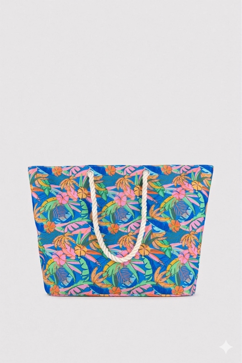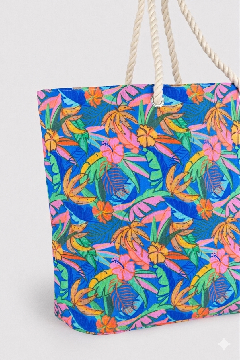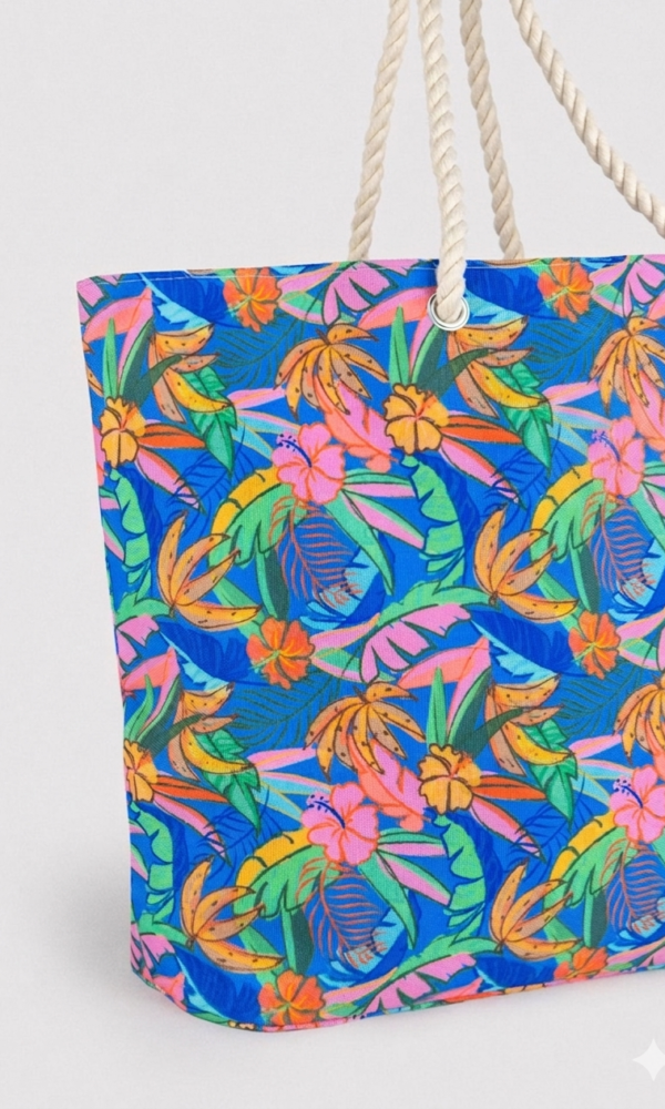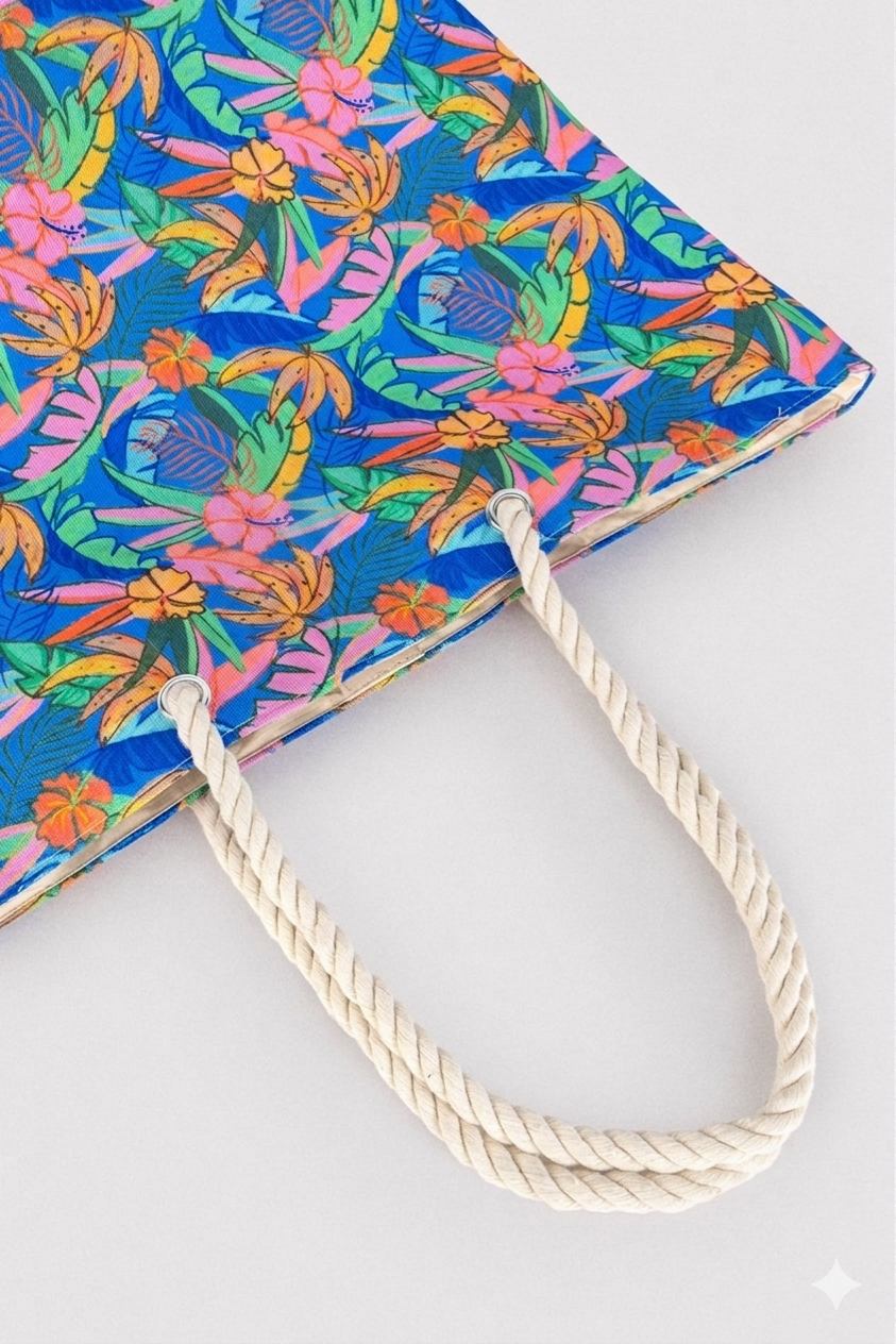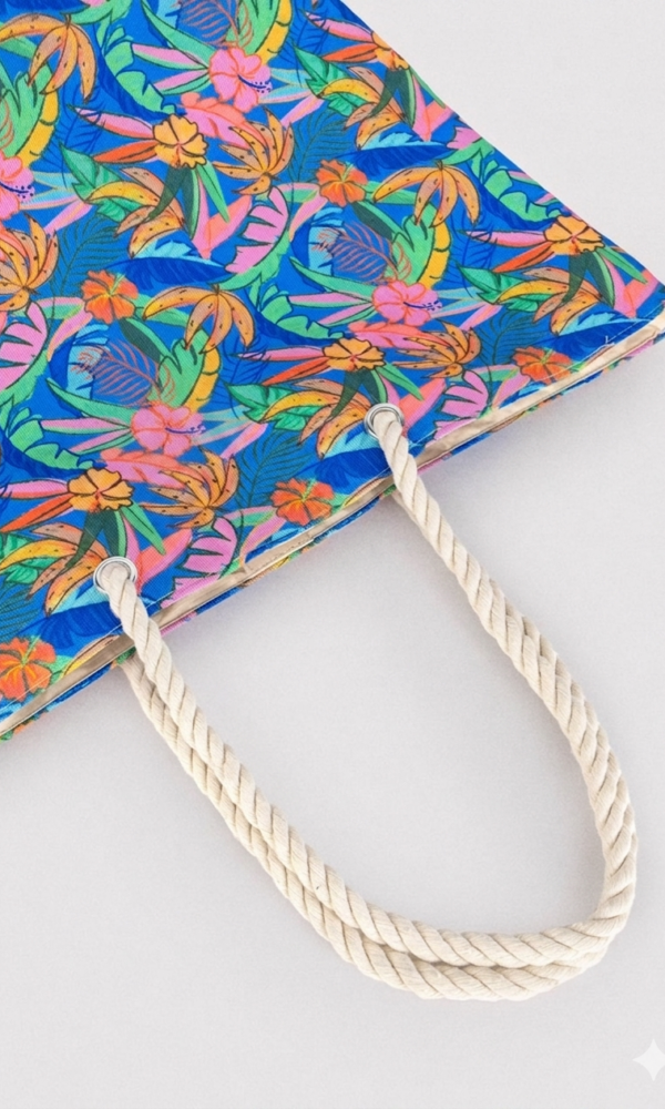 Bolso de playa de tela con asas de cuerda. Diseño de gran capacidad con un estampado tropical vibrante. Cierre con botón de presión snap.