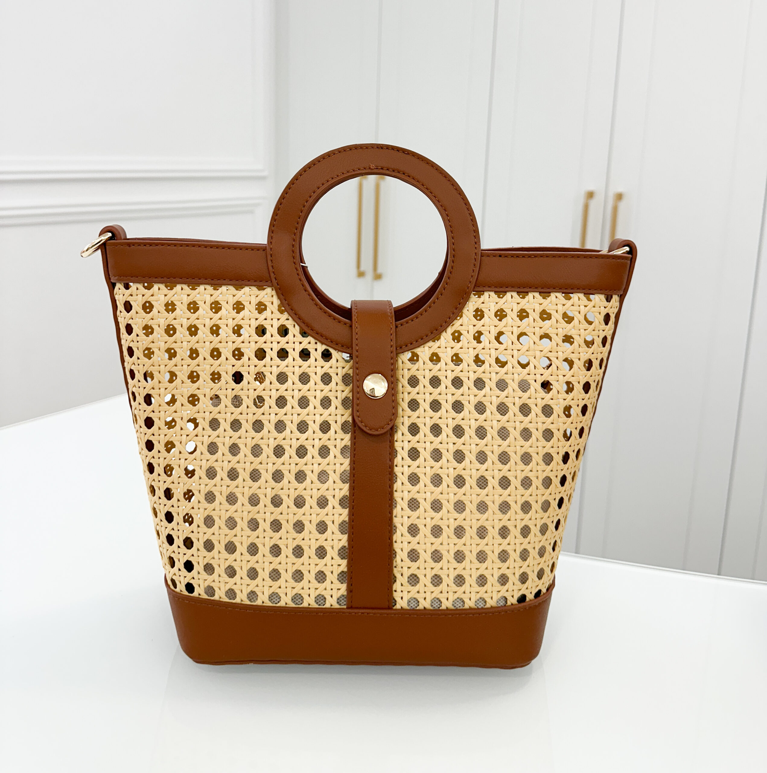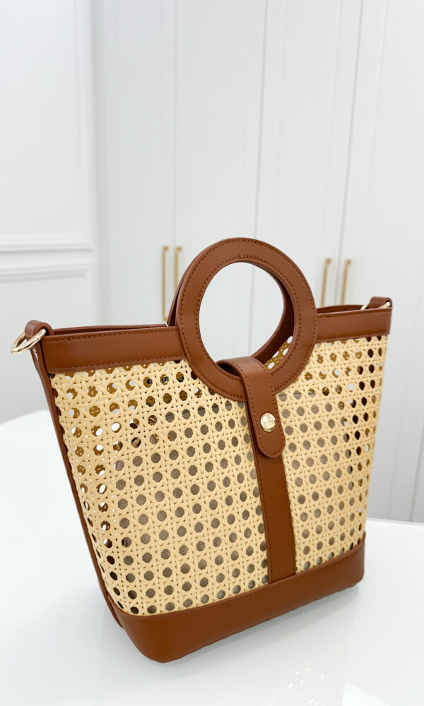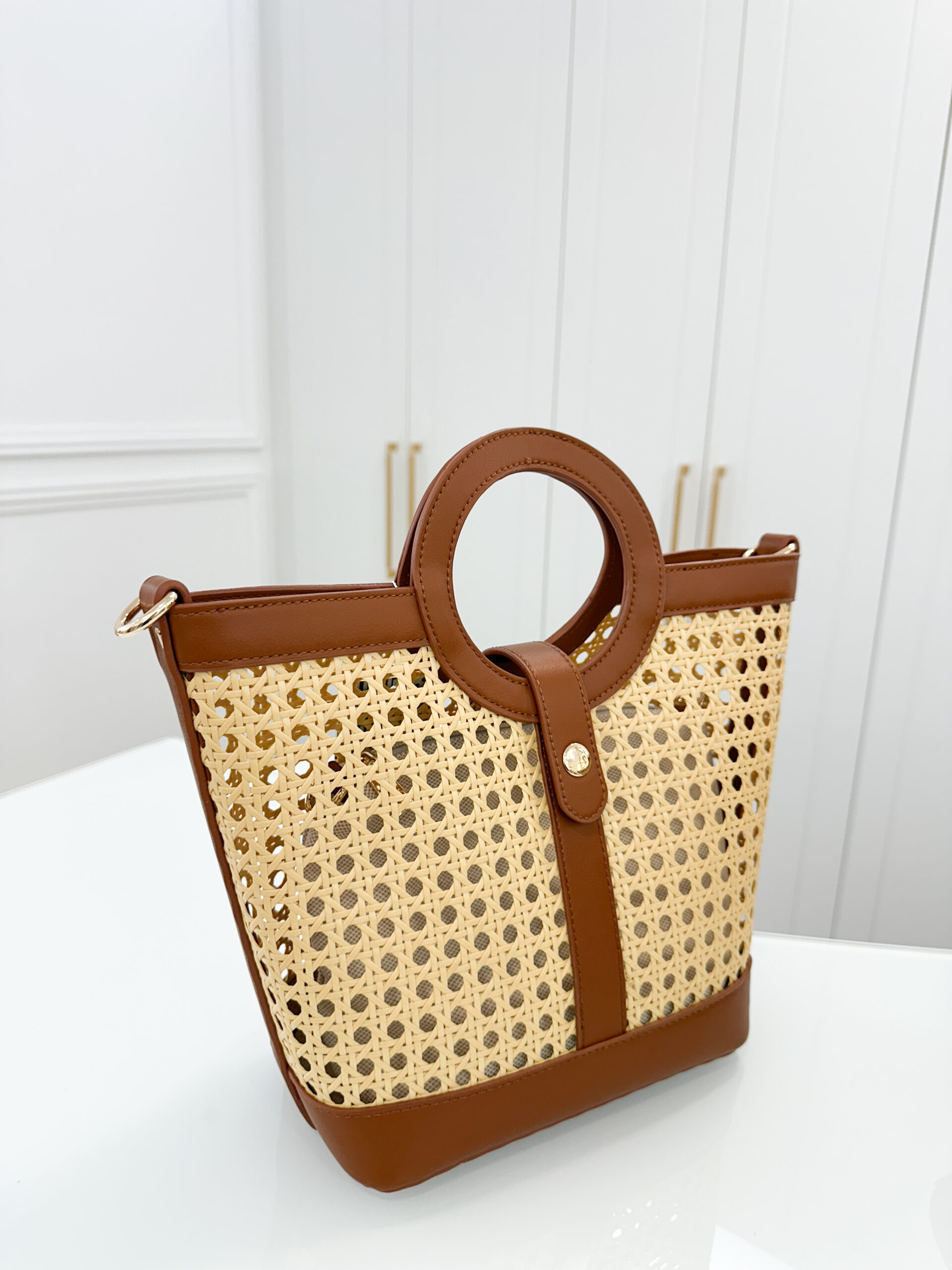 Este bolso presenta un tejido efecto de ratán con detalles en ecopiel, incluyendo el borde superior, el asa y la correa decorativa. Su forma es de un tote estructurado con una silueta ligeramente cónica, ofreciendo espacio para llevar objetos. El asa redonda y la construcción en ecopiel aportan un toque elegante y estilizado al diseño general.