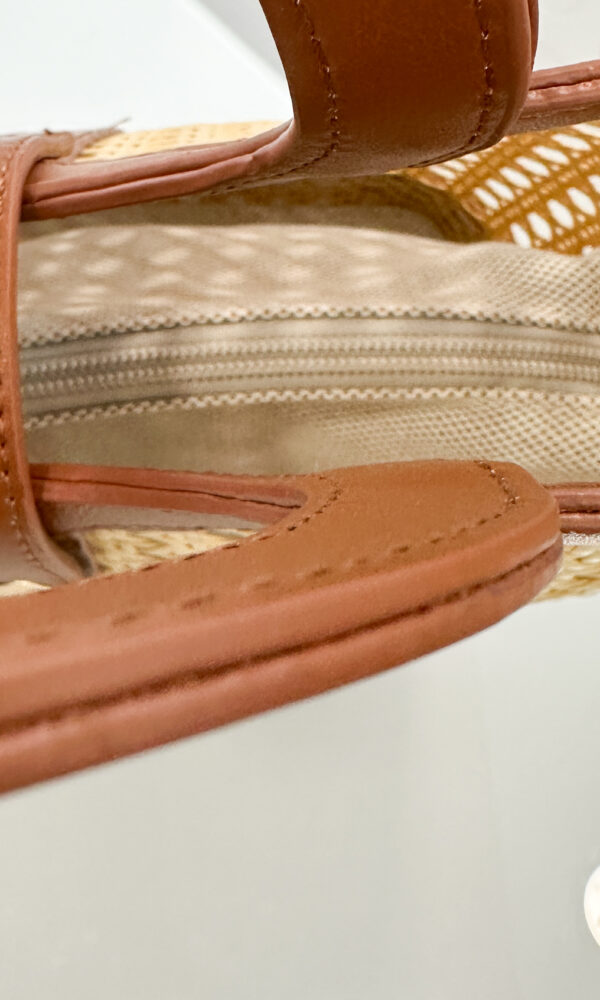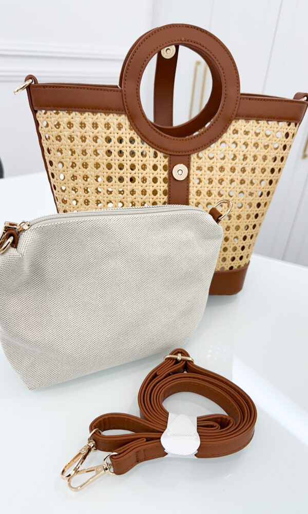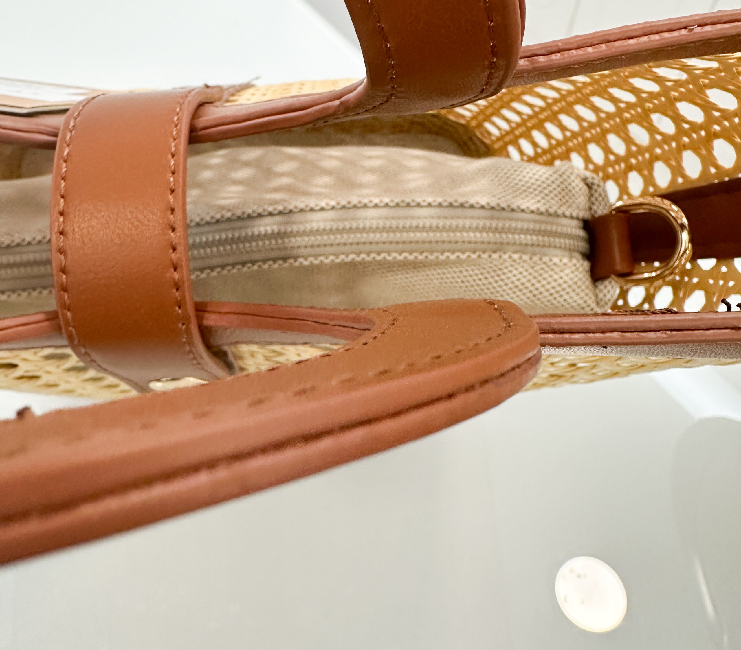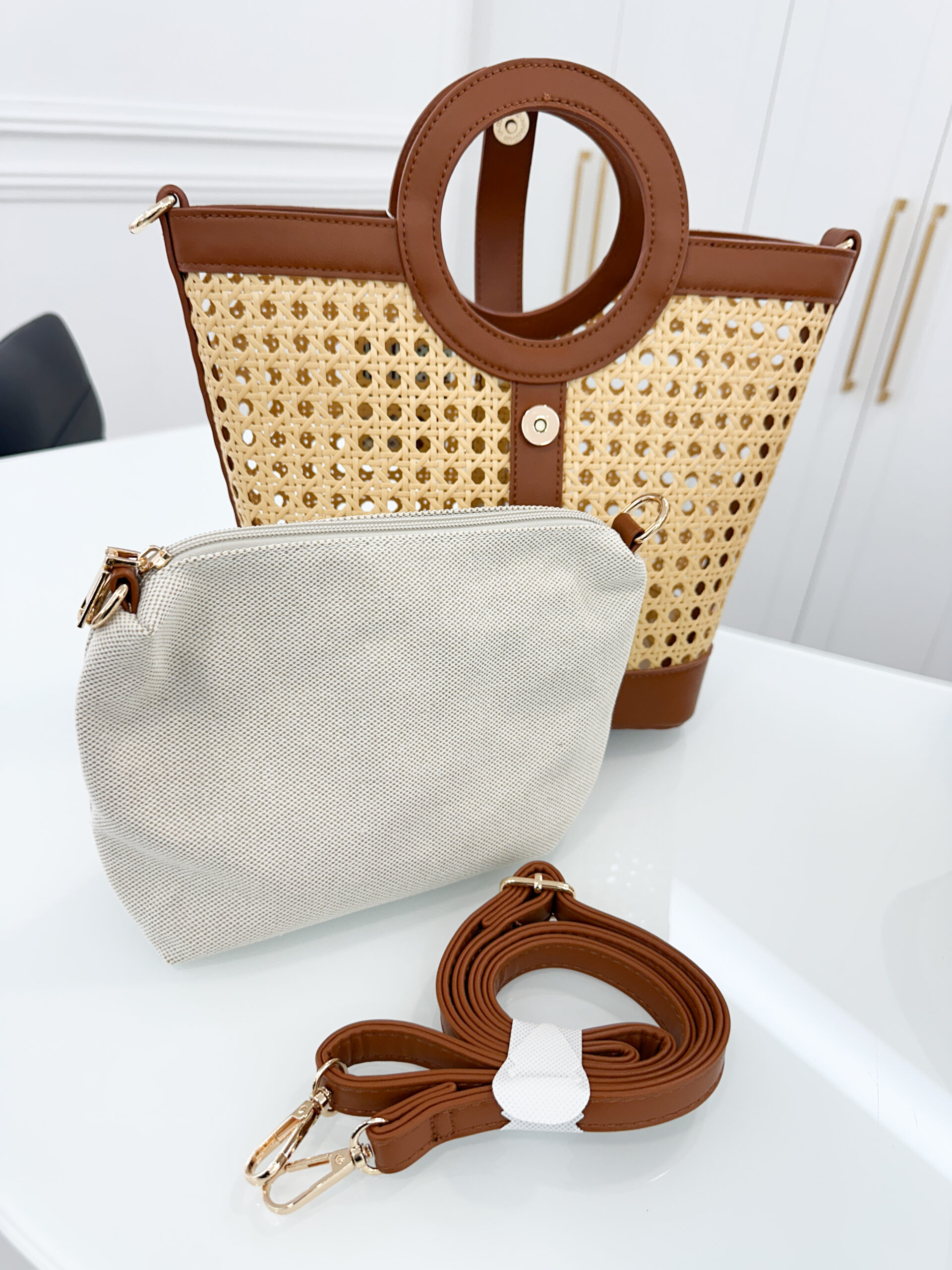 Este bolso presenta un tejido efecto de ratán con detalles en ecopiel, incluyendo el borde superior, el asa y la correa decorativa. Su forma es de un tote estructurado con una silueta ligeramente cónica, ofreciendo espacio para llevar objetos. El asa redonda y la construcción en ecopiel aportan un toque elegante y estilizado al diseño general.