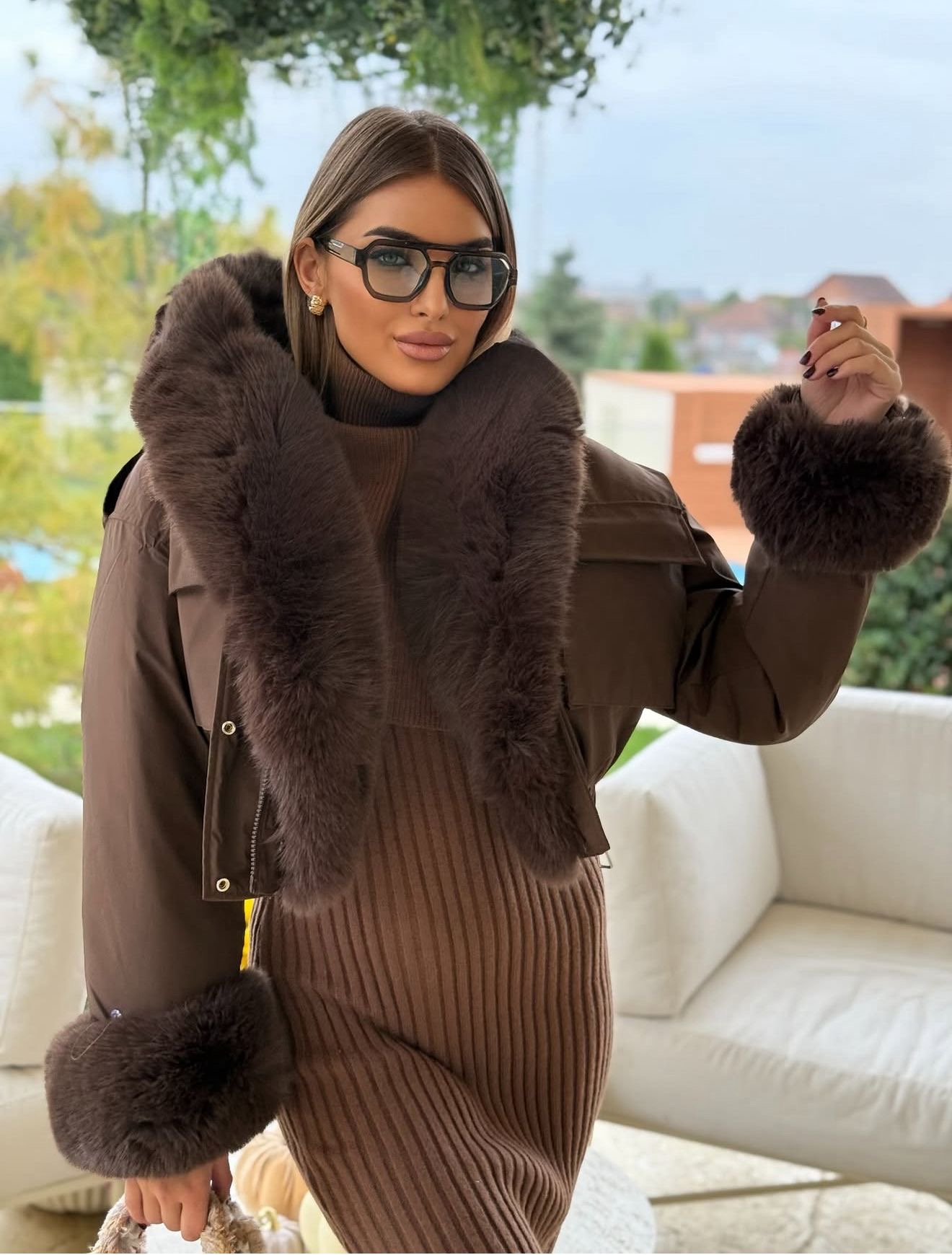 Chaqueta con capucha integrada y suave pelo desmontable en el cuello y los puños. Cierre frontal de cremallera oculta bajo tapeta con botones a presión. Dos bolsillos de parche con solapa y botón de presión en la parte delantera. Cintura elástica en la parte trasera. Mangas largas rectas.