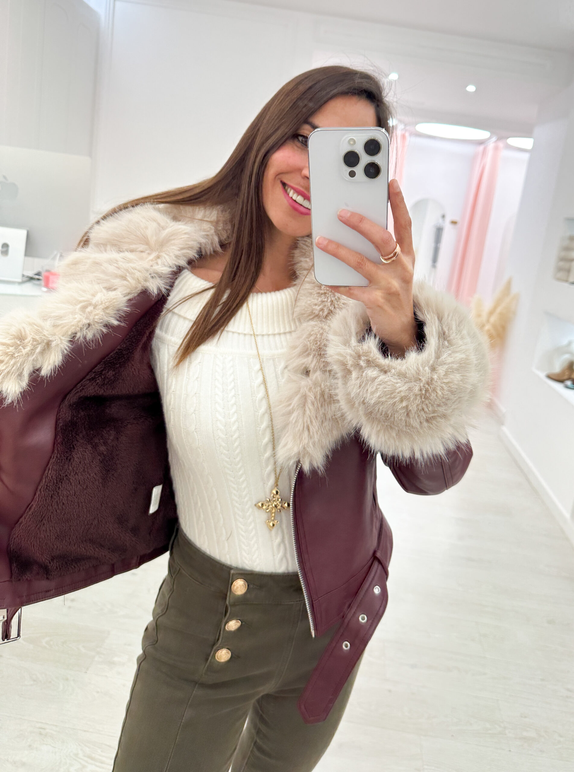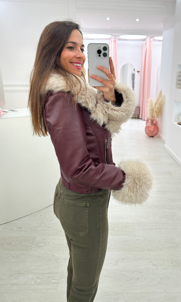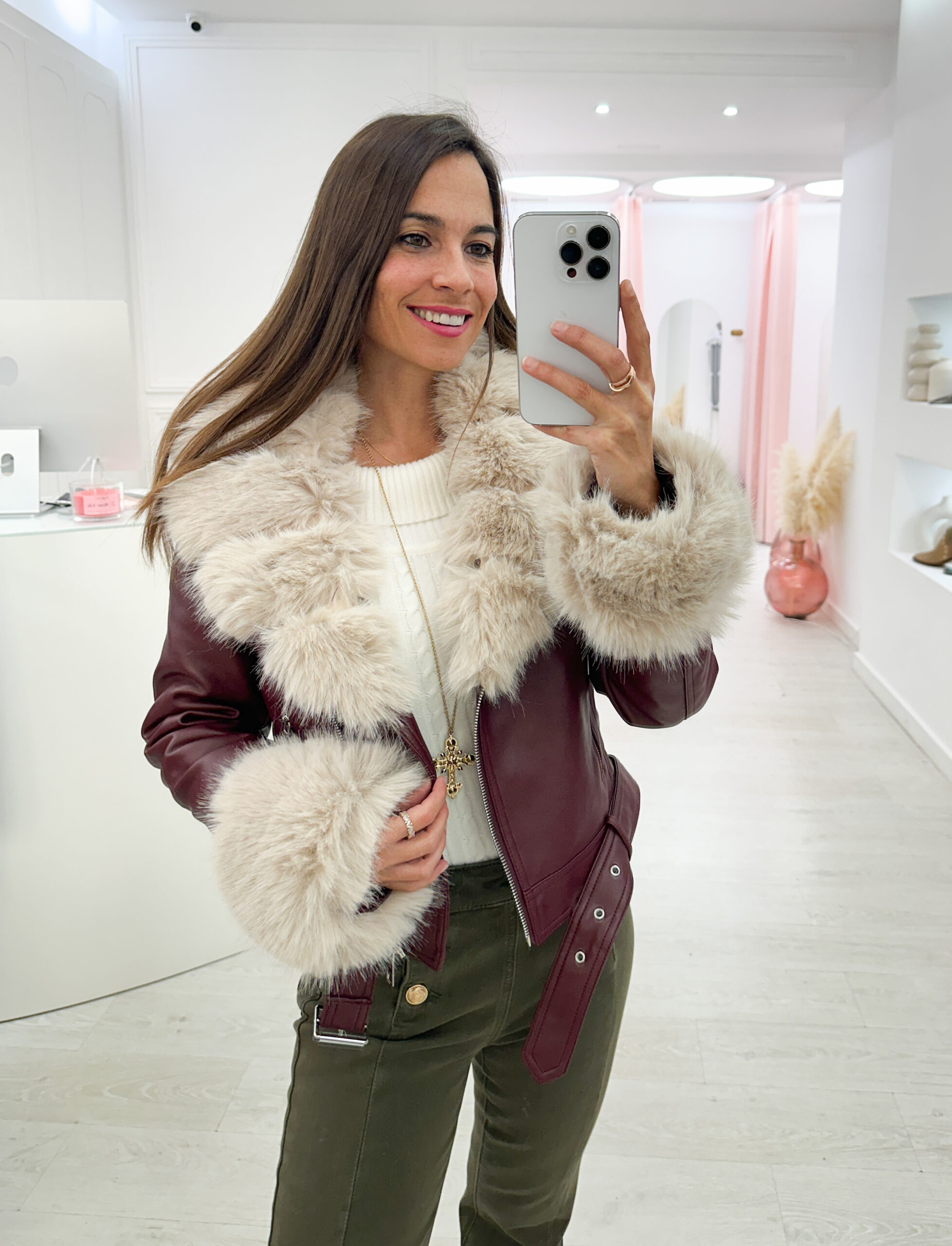 Chaqueta forrada con el interior de suave pelo en Burdeos. Pelo en cuello y puños desmontable. Cinturón del mismo material y color incluido.