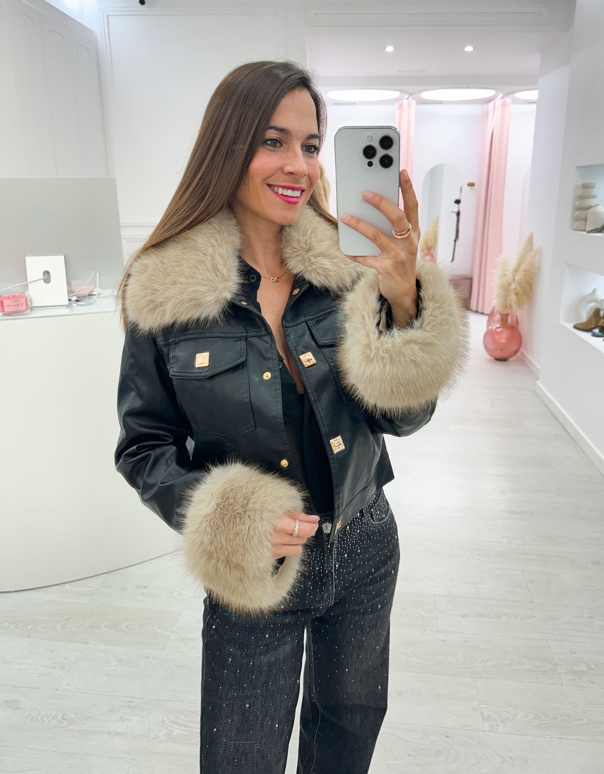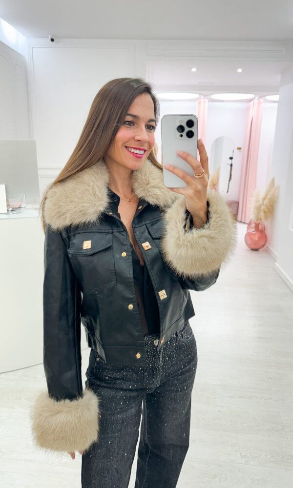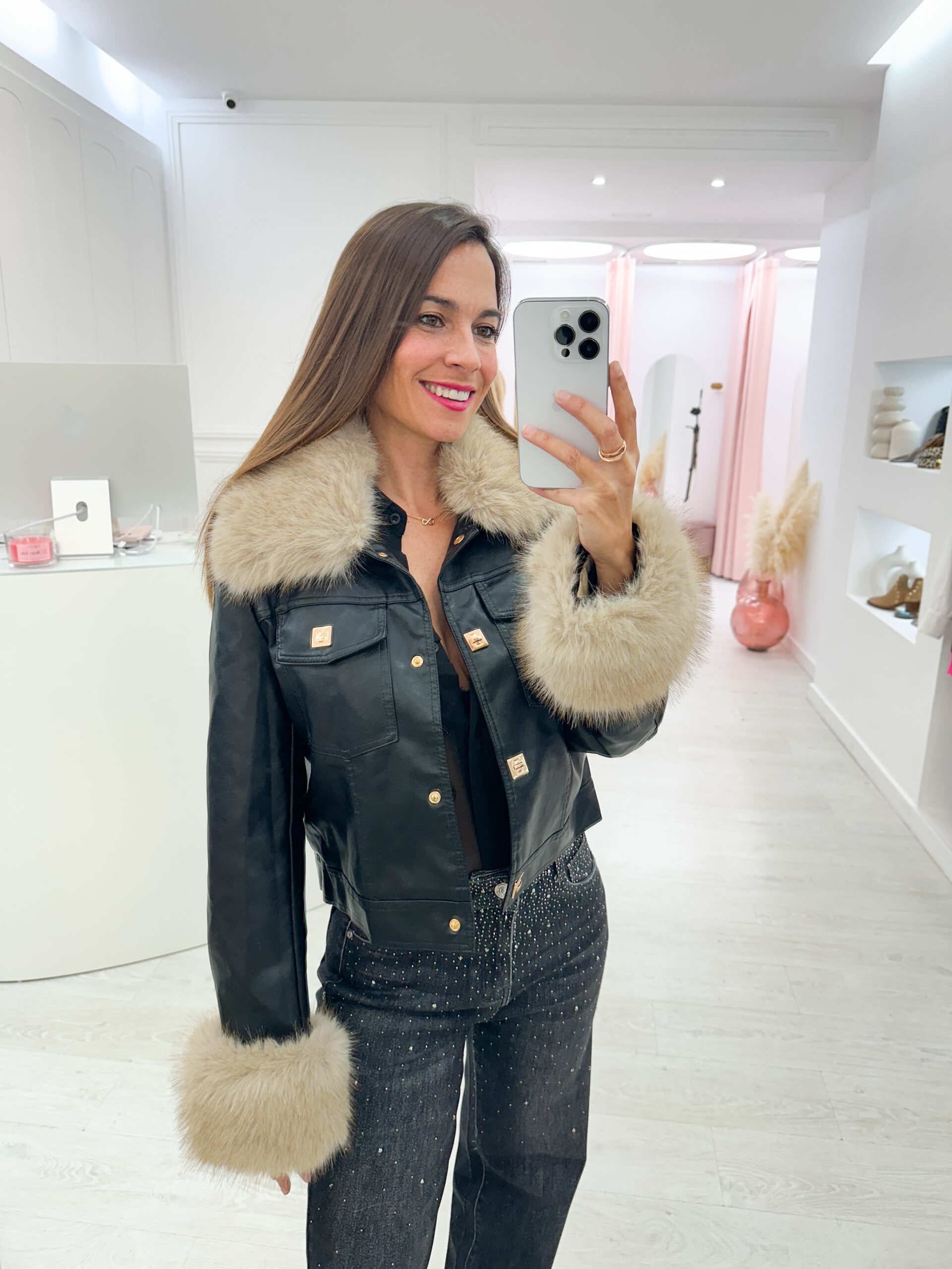 Chaqueta en color negro forrada en su interior con pelo en color taupe. Cuello y puños de suave pelo desmontable mediante botones.