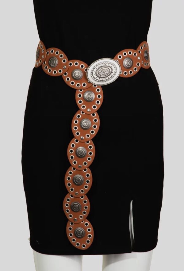 Este cinturón en color marrón exhibe un estilo boho único ,occidental y con hebilla en plata. El cinturón es ajustable gracias a los ojales que tienen los discos.
