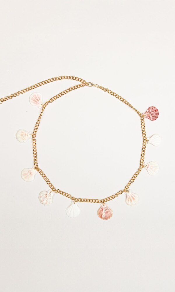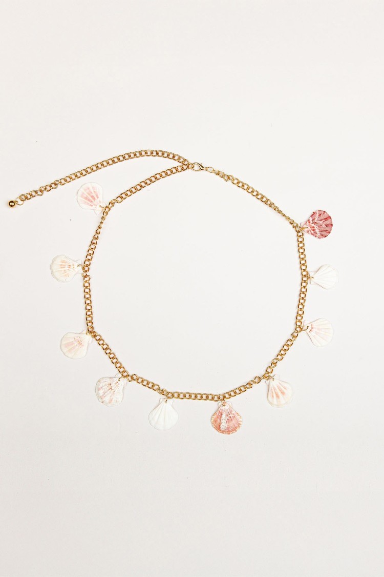 Cinturón de cadena ajustable con mosquetón. Detalle de conchas.