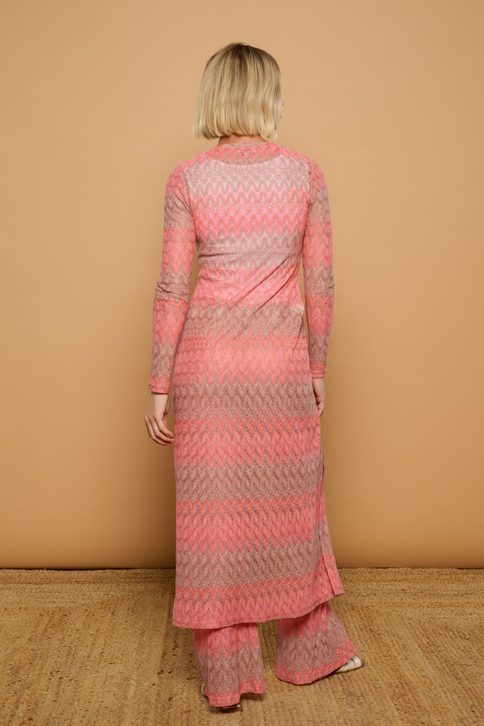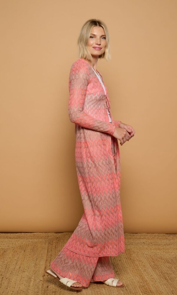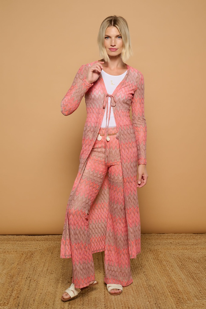 Luce un diseño místico con el Kimono Salia. Este modelo largo destaca por su original patrón de zigzag multicolor sobre una malla fina y transparente. Con un favorecedor cierre de lazo en el pecho, manga larga y un tejido elástico que garantiza un ajuste cómodo y flexible, es la prenda perfecta para crear looks llenos de personalidad y sofisticación.