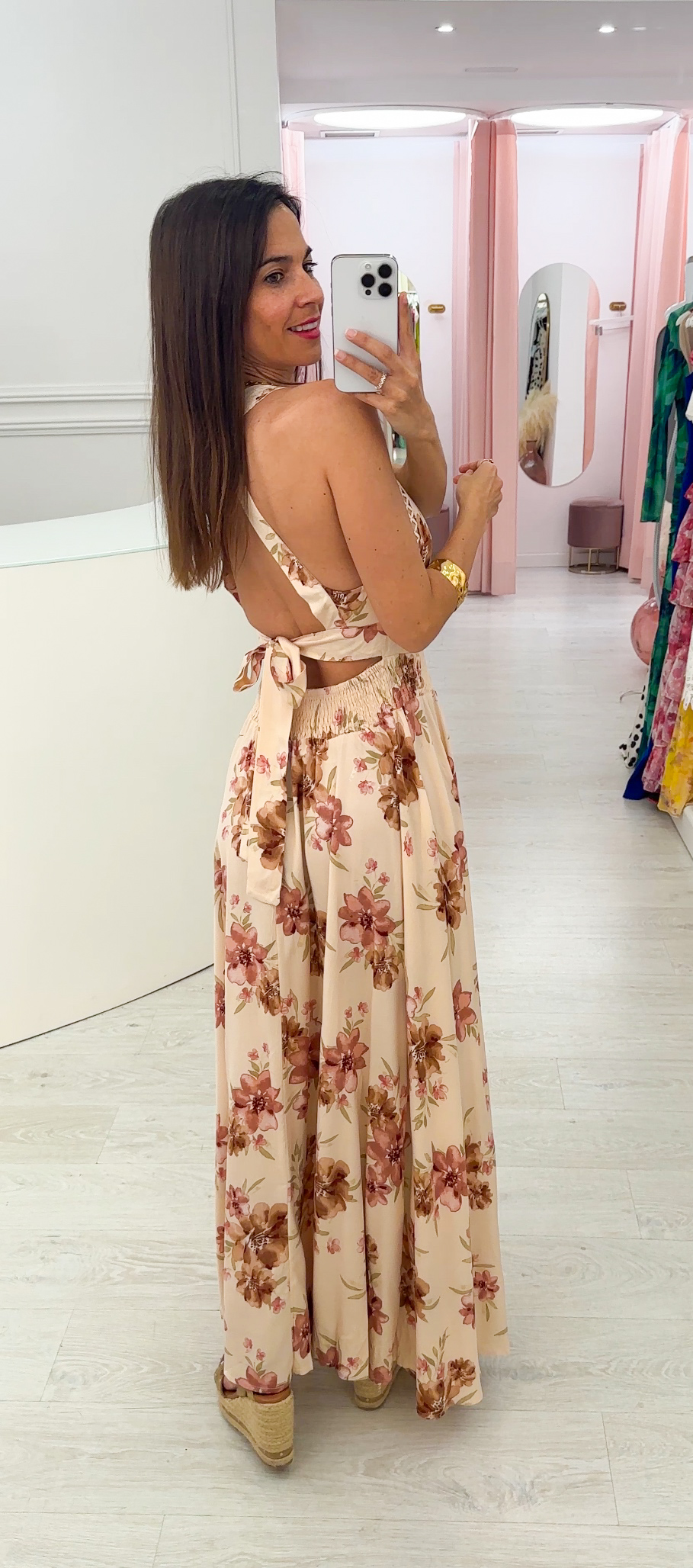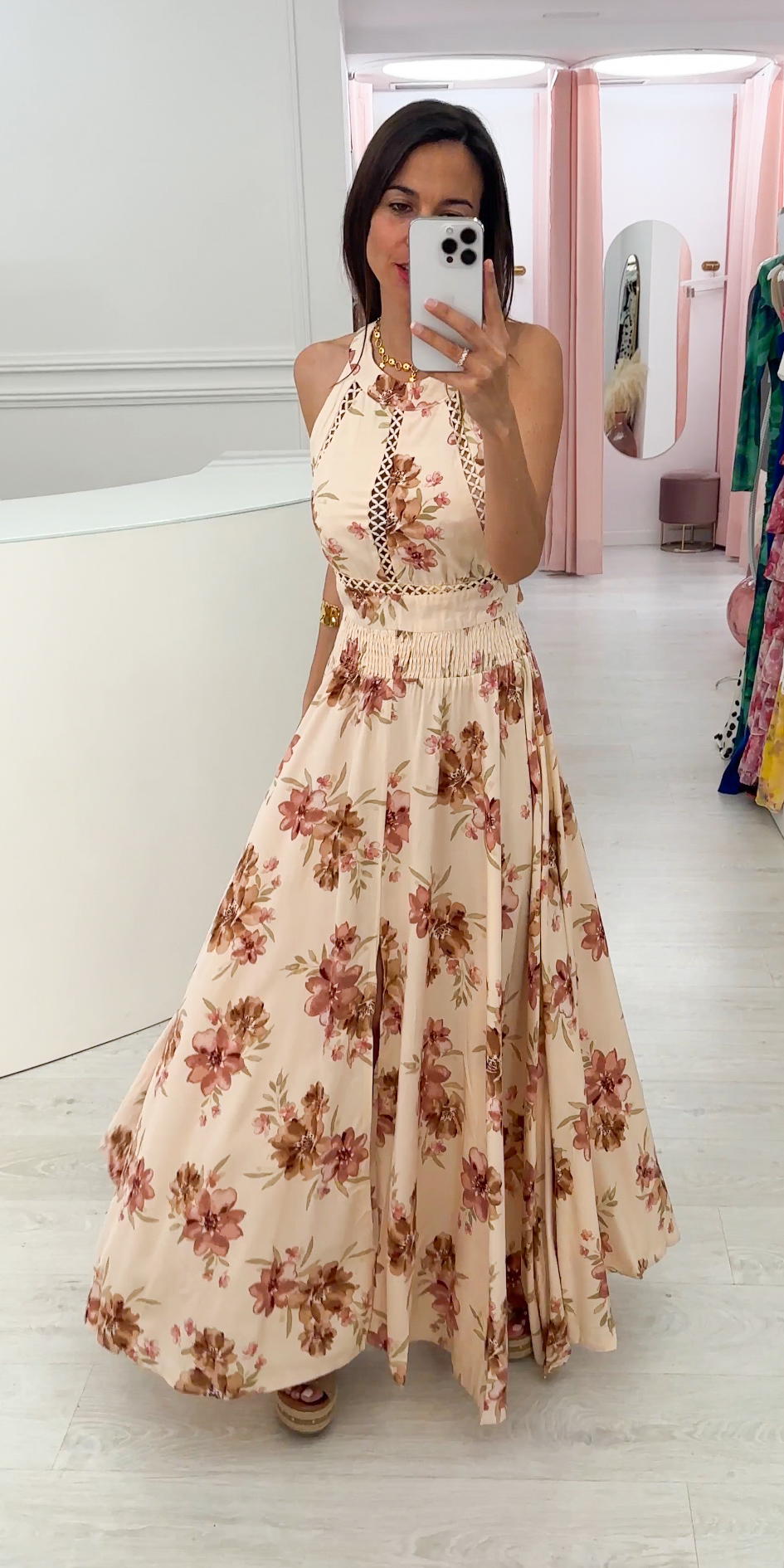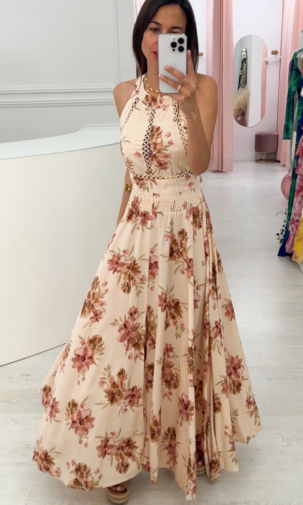 Precioso vestido con un delicado estampado floral. Tiene un cuello halter que se ajusta con dos botones en la parte trasera del cuello y con una lazada que realza y sujeta el pecho, además tiene doble tejido en la zona del pecho. Su cintura es ajustada lo cual realza la silueta con goma en la espalda. La falda tiene mucha caída y vuelo con corte central. Es una opción perfecta para eventos primaverales o veraniegos,o para looks más casuales. Ideal para conseguir una imagen femenina, fresca y elegante.