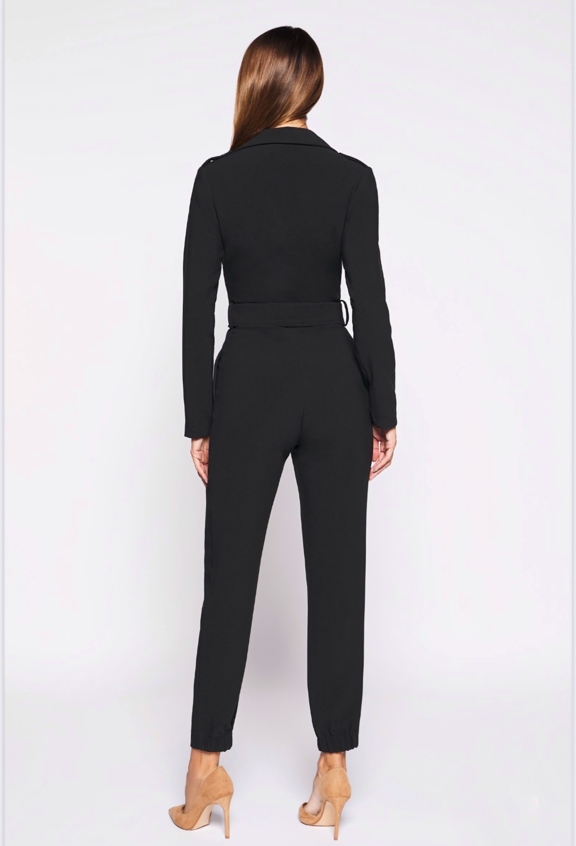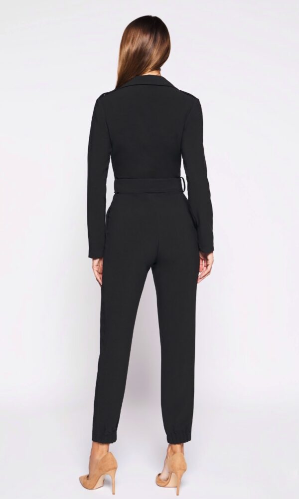 Mono de mujer en color negro , combina el estilo sofisticado de un traje sastre con la comodidad de una sola prenda. Su diseño entallado con cuello solapa cruzado, doble botonadura y cinturón ajustable con hebilla realza la figura y aporta un toque moderno y versátil, la prenda es elástica.
