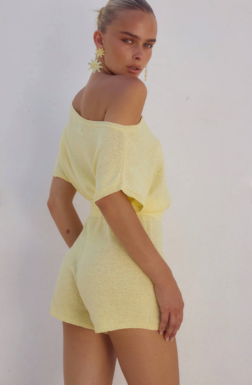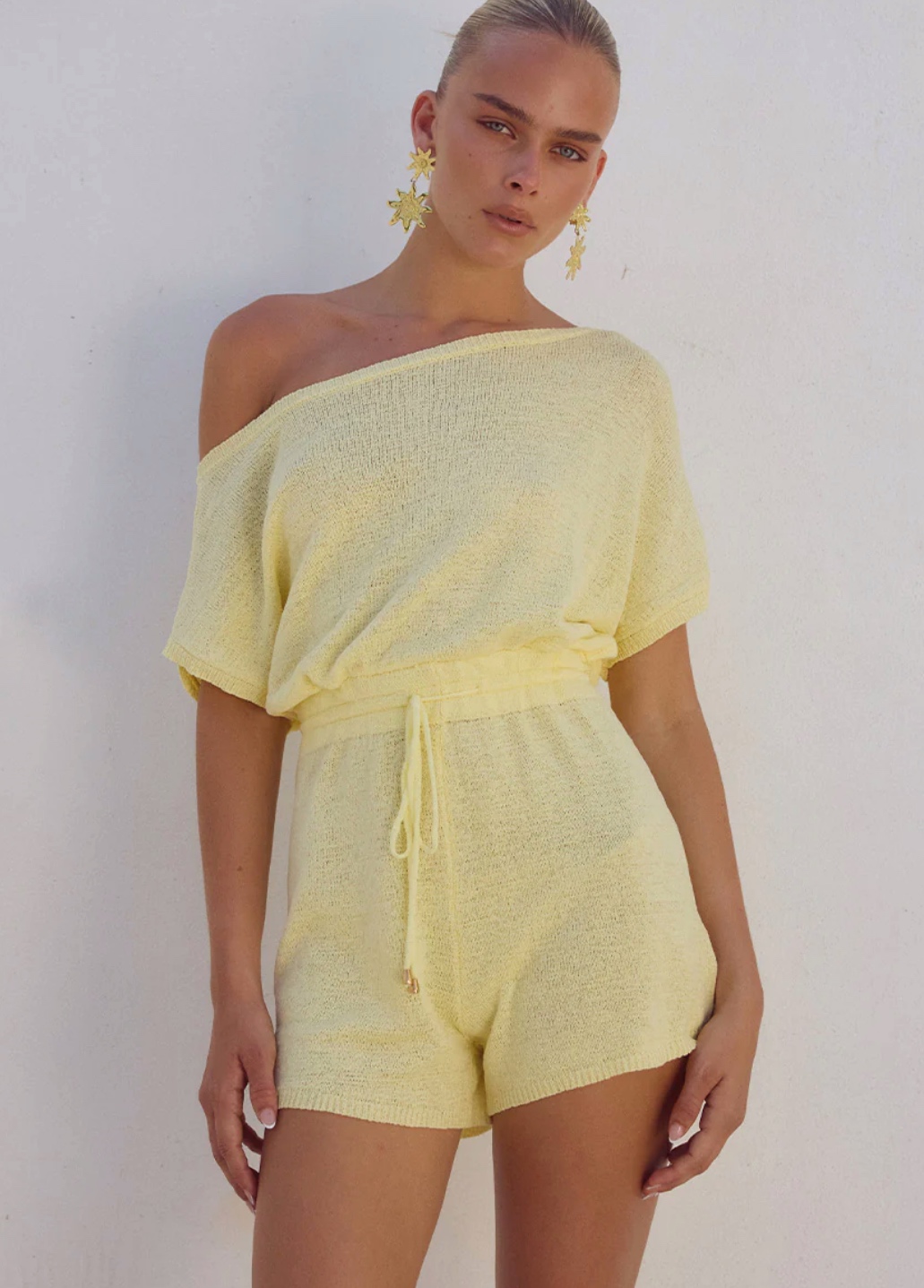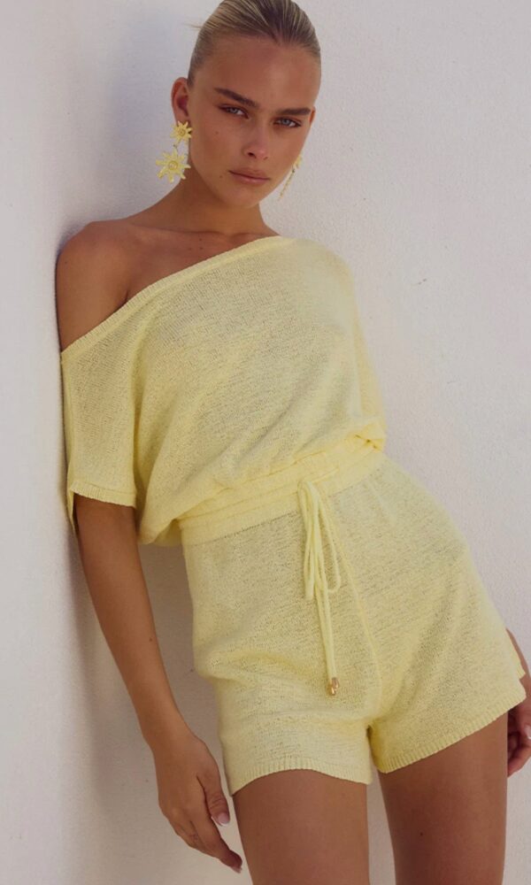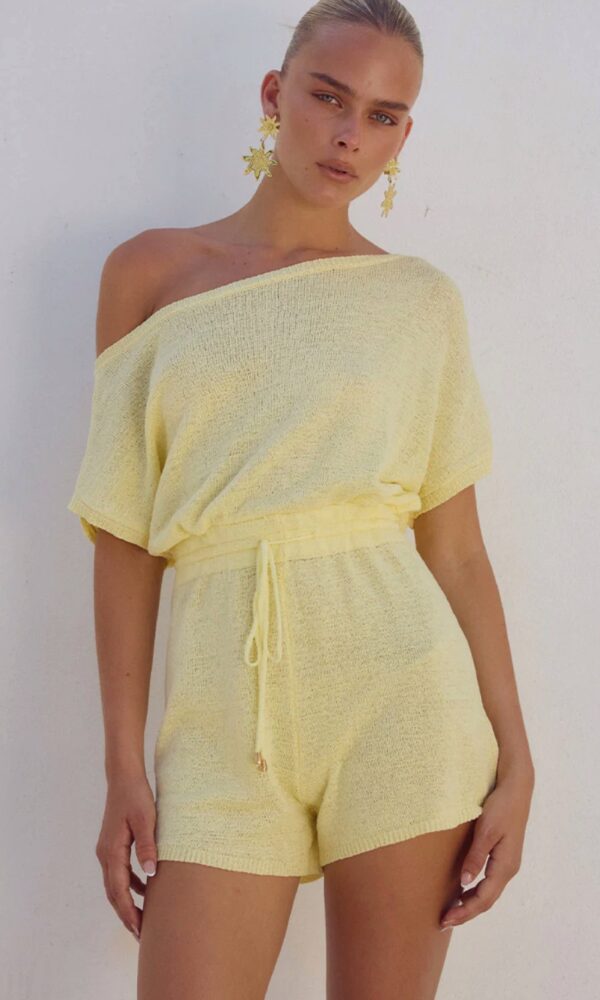 Mono de punto hecho a mano con tejido de lujo, tiene escote asimétrico y cinturilla elástica.
