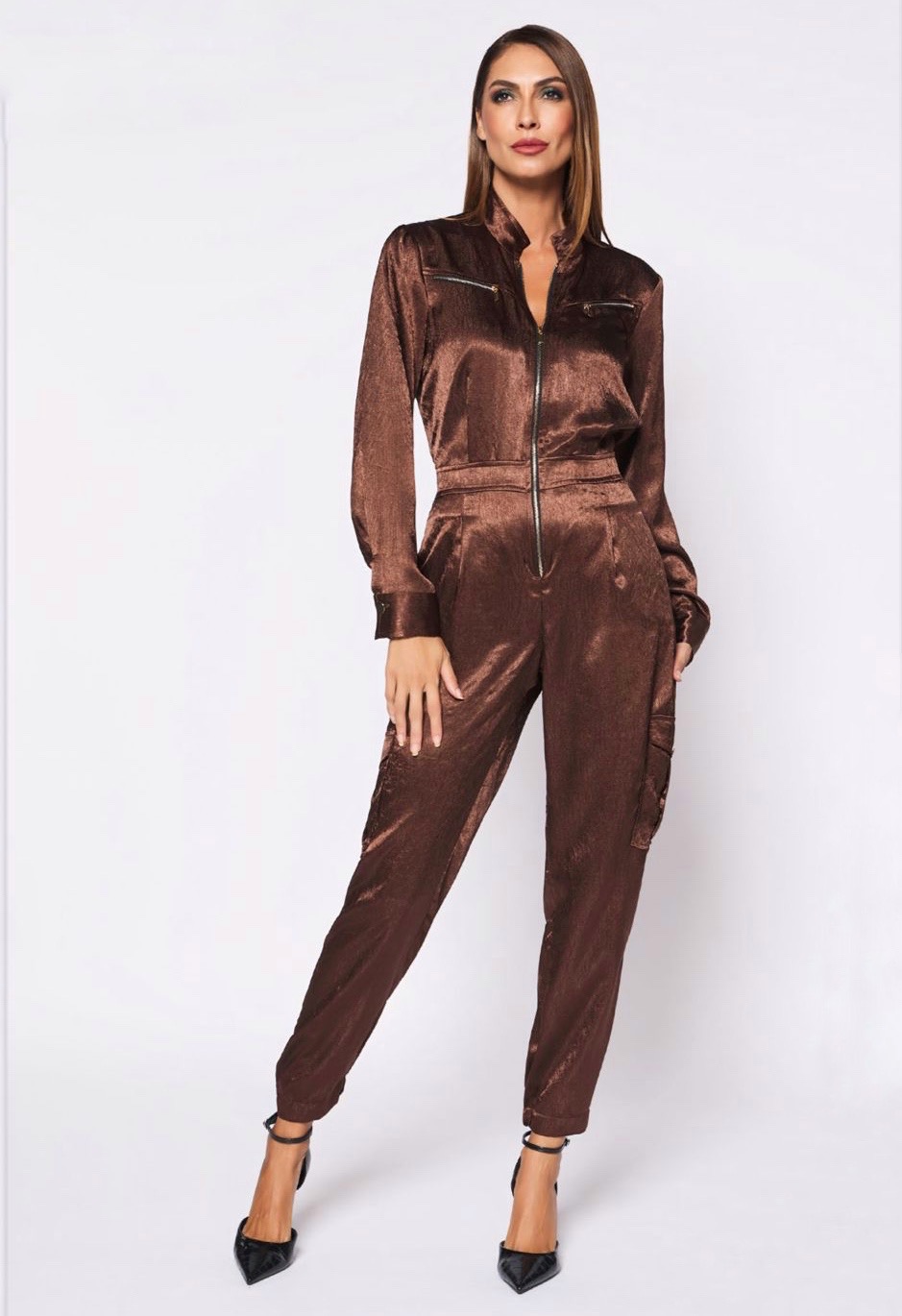 Descubre el equilibrio perfecto entre comodidad y glamour con este mono satinado marrón para mujer. Su diseño con cremallera frontal, corte femenino y tejido de brillo sutil lo convierten en una prenda moderna, elegante y diferente, ideal para destacar en cenas, eventos o looks de noche.