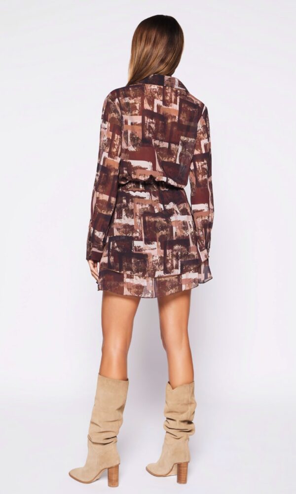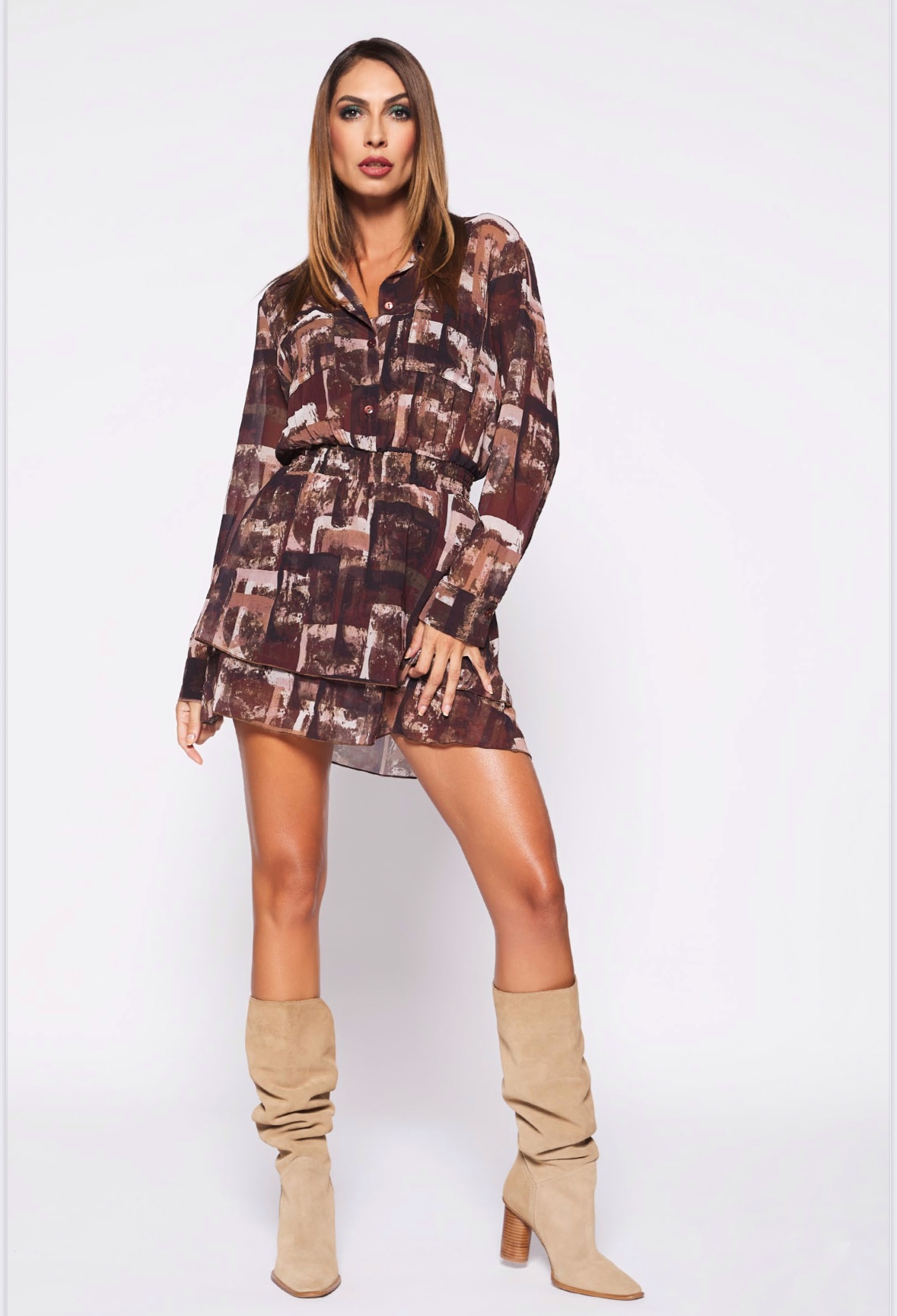 Este mono corto de mujer estampado en tonos marrón y beige es la prenda perfecta para un look moderno y versátil. Su diseño de camisa con botones y cuello camisero, combinado con una falda-pantalón efecto vestido, aporta un estilo fresco y sofisticado ideal para cualquier ocasión.