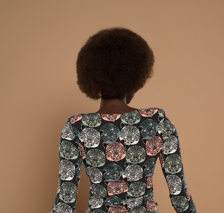 Camiseta de escote cuadrado y manga francesa. Estampado de guepardos en verdes, negros y salmón. Tejido elástico.