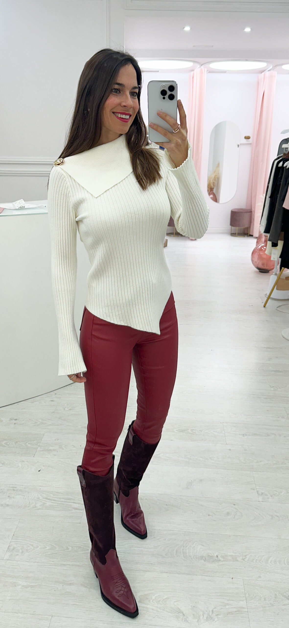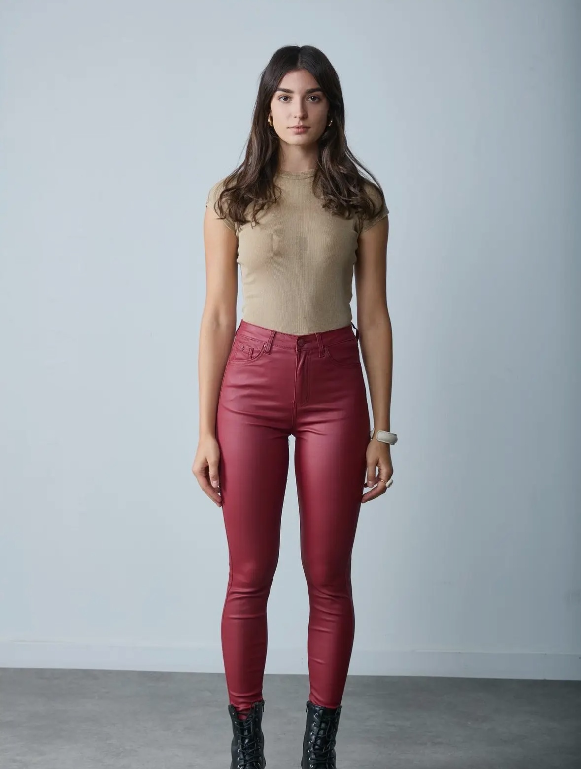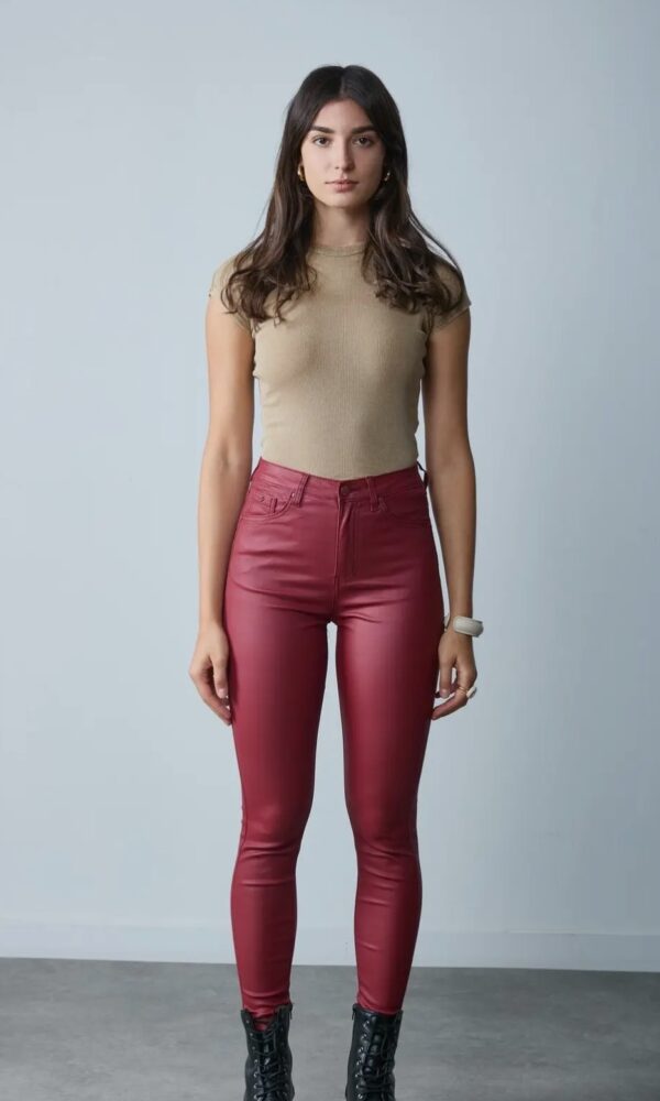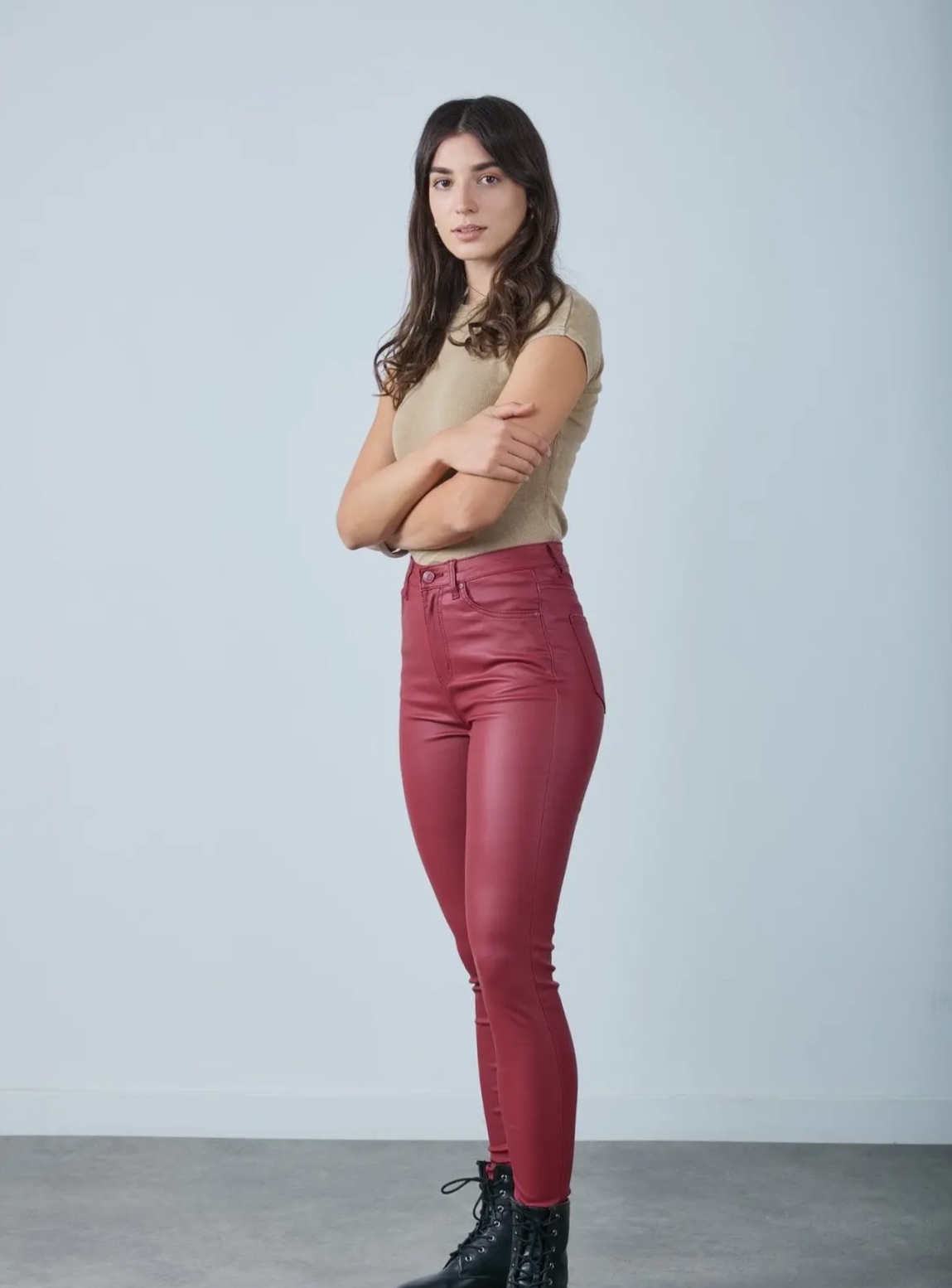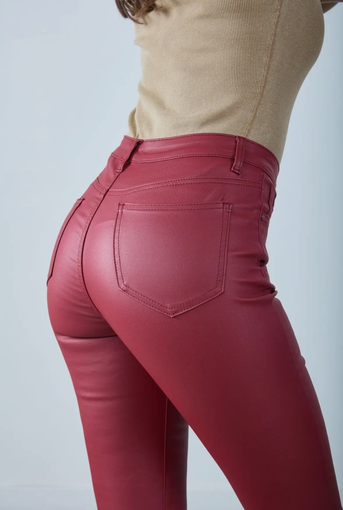 Pantalón encerado en color Rojo-Burdeos, confeccionado en un tejido superelástico, es muy cómodo y ofrece un corte slim, cierre de cremallera. Se distingue por su efecto push-up el cual realza la figura.