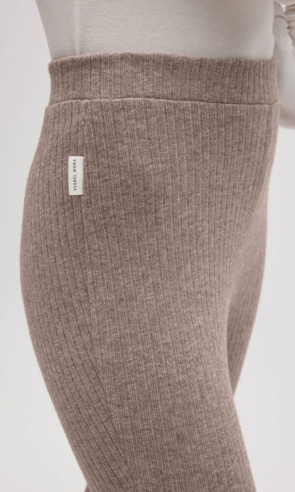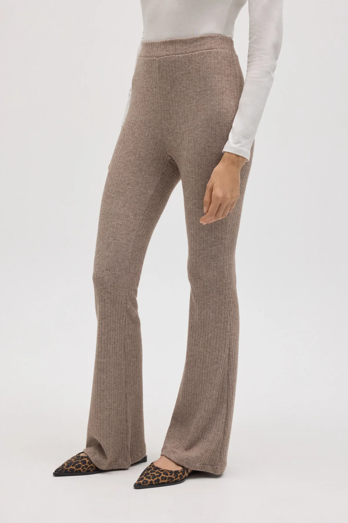 Pantalón acampanado de punto canalé suave y cómodo. Su silueta flare estiliza la figura y su cintura elástica se adapta al cuerpo sin presiones. Ideal para looks relajados o combinar con el jersey a juego para un total look moderno.