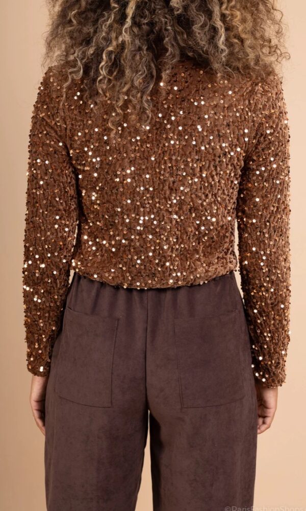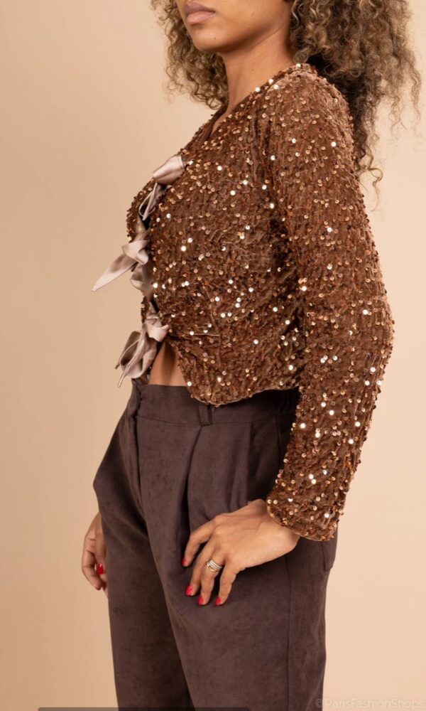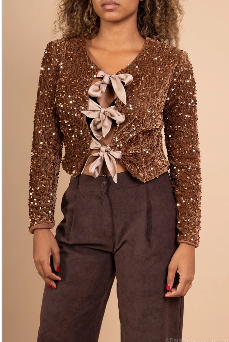 elegante suéter corto de terciopelo adornado con lentejuelas brillantes en un cálido tono bronce, perfecto para un look sofisticado. Se destaca por sus mangas largas y su diseño abierto al frente, cerrado por dos delicados lazos de satén beige, que añaden un toque femenino y refinado.