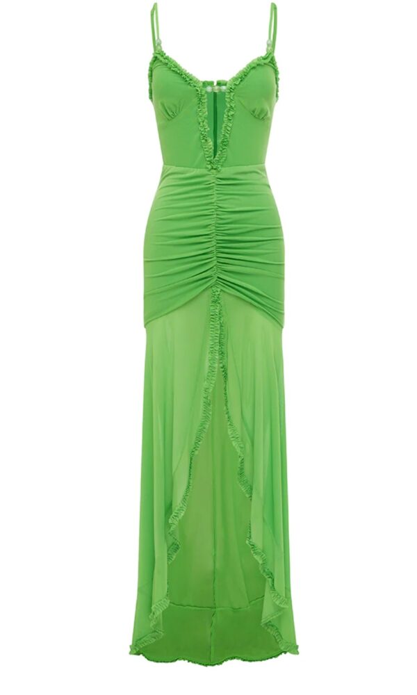Elegancia dramática, este vestido maxi presenta detalles de cuentas y micro volantes con una abertura central.Preciodo color verde.