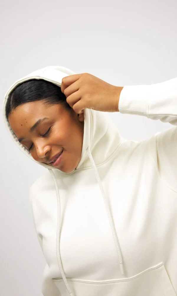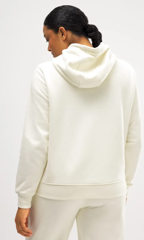 Sudadera afelpada marfil con capucha ajustable y bolsillo tipo canguro. Interior suave y cálido, corte relajado y tejido confortable, ideal para uso diario, viajes o looks comfy y athleisure.