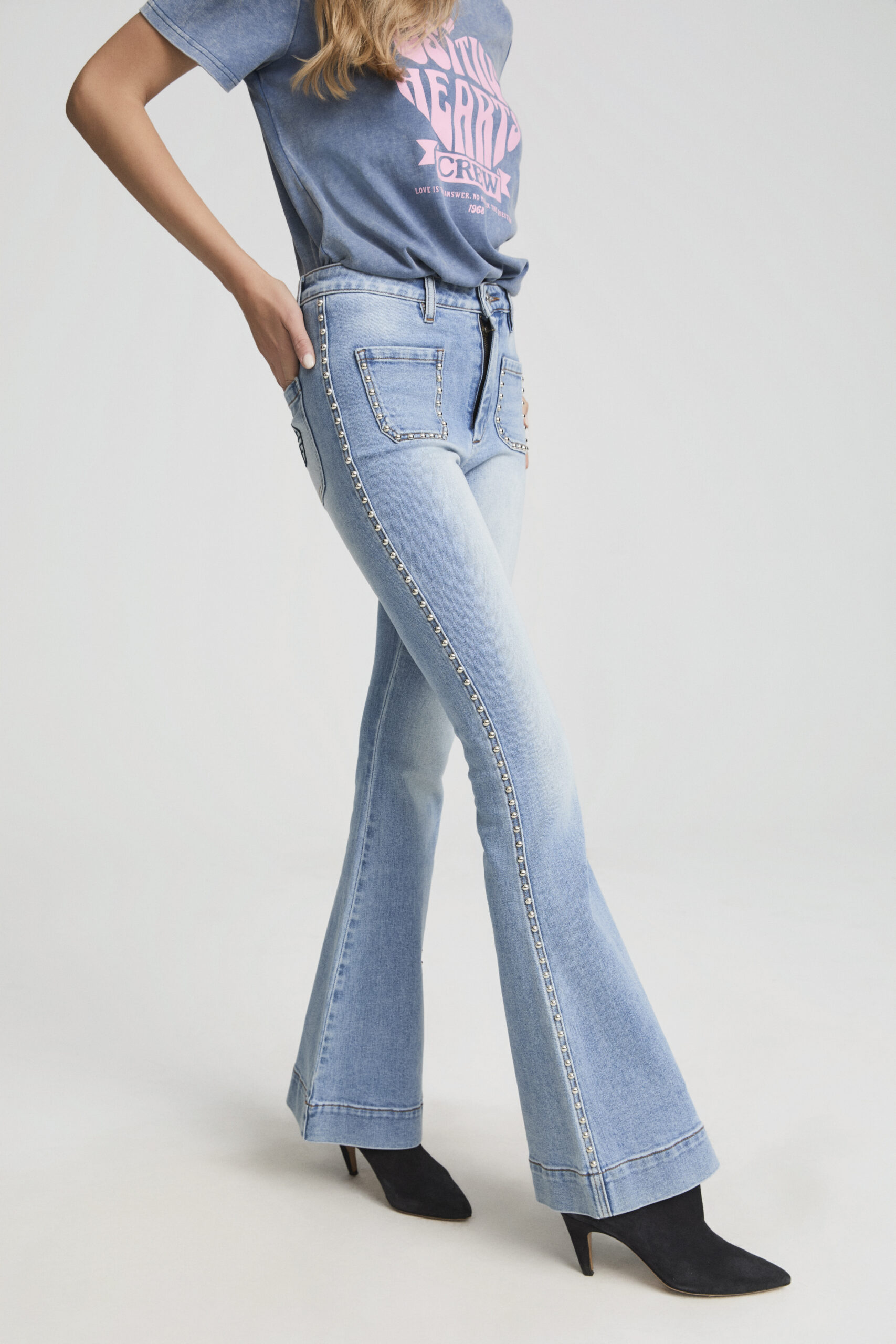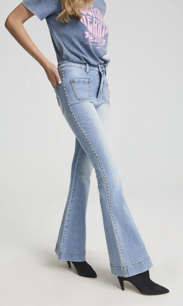 Vaquero flare con detalles bordados en el lateral, inspirado en el estilo setentero con un toque moderno. Su corte ajustado hasta la rodilla y bajo acampanado realzan y alargan la silueta. Confeccionado en denim suave y ligeramente elástico, ofrece comodidad y una forma perfecta. Los bolsillos con tapeta y la cinta decorativa lateral aportan un aire sofisticado. Ideal para combinar con camisetas básicas o blusas románticas.