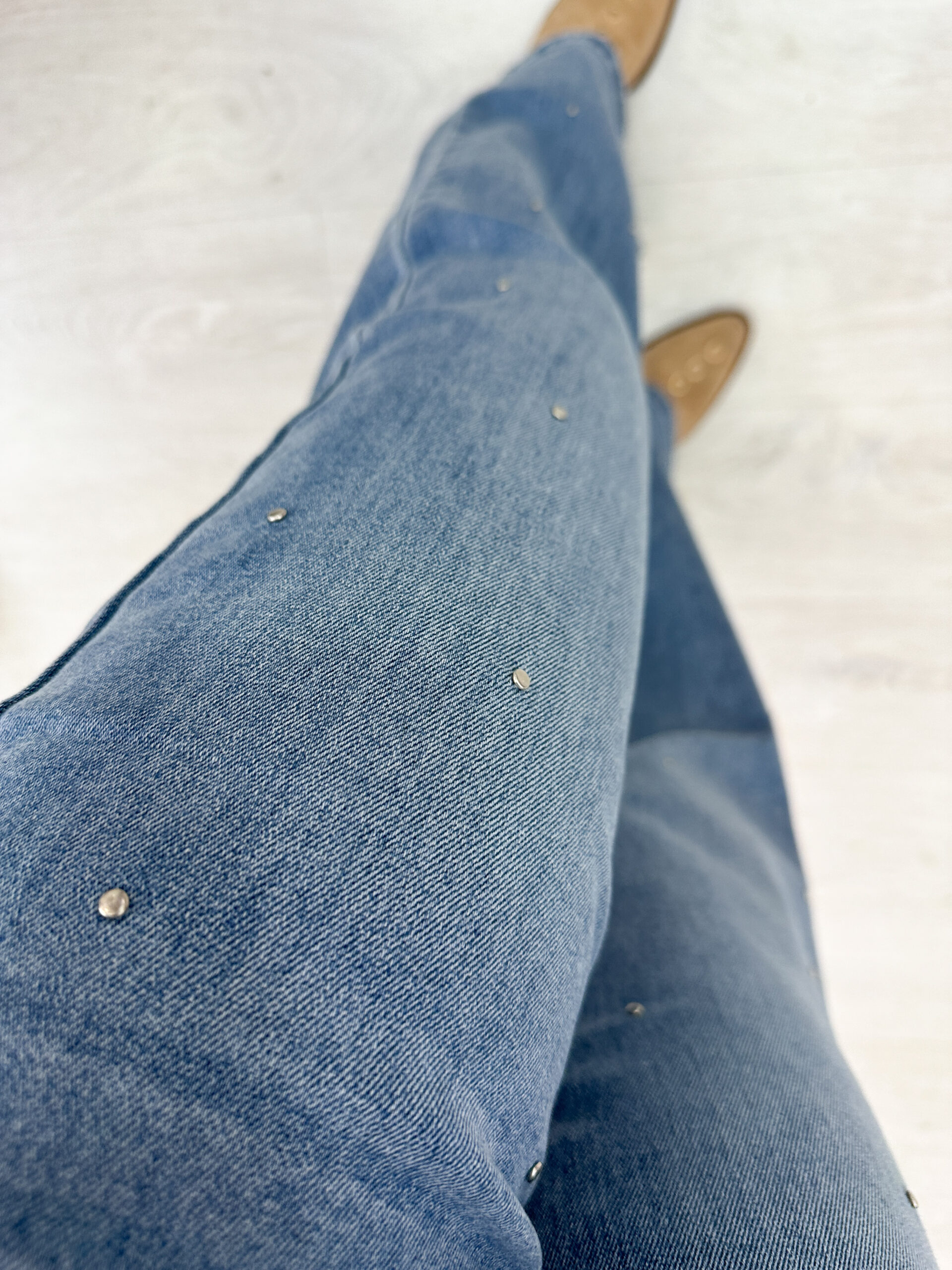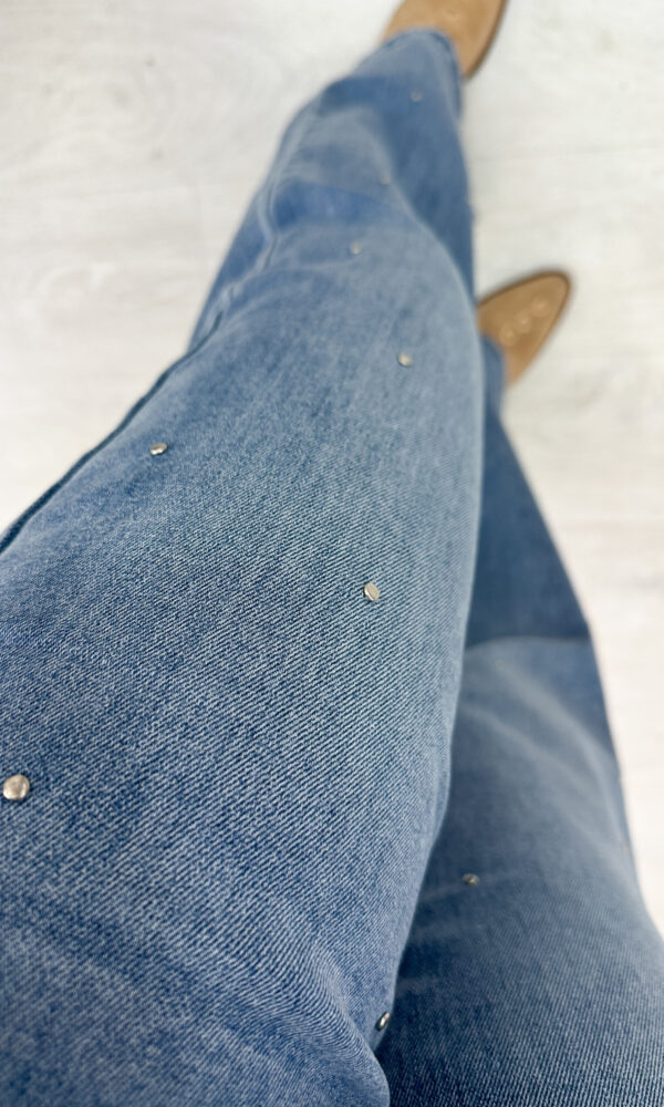 Este vaquero recto presenta destellos metálicos incrustados en la parte delantera, aportando un toque de brillo sutil y moderno.