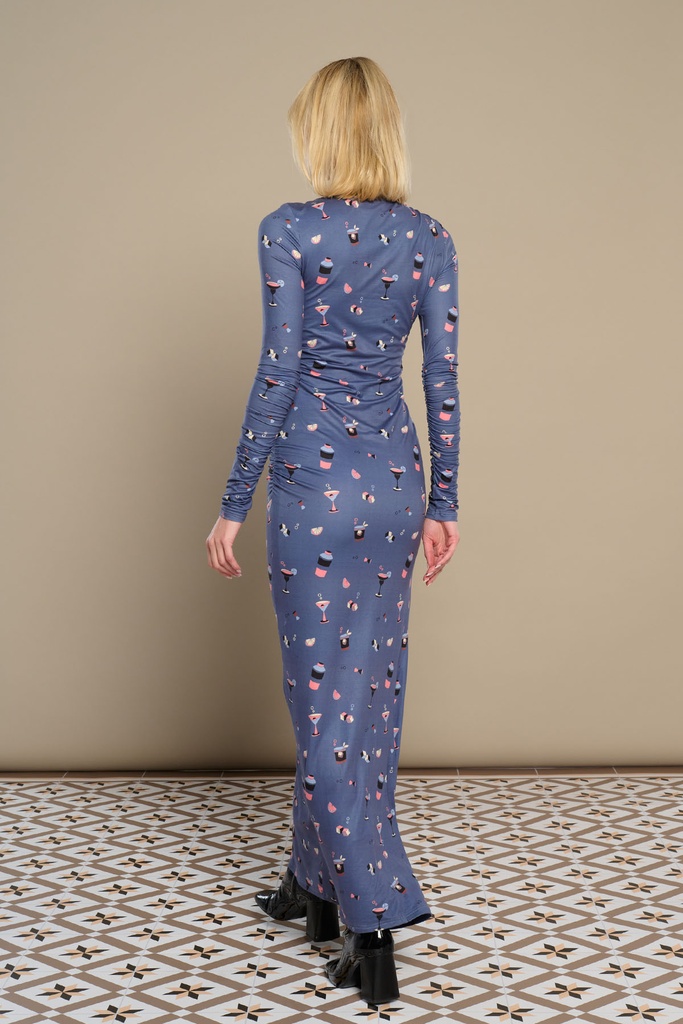 Vestido largo de cuello redondo y manga larga. Forro interior. Tejido elástico. Estampado coctel.