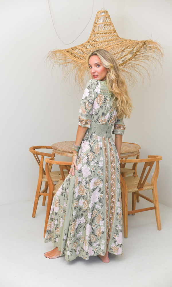 Vestido largo con un estampado floral boho con base verde suave y flores en tonos rosa y mostaza. Una combinación luminosa, femenina y muy primaveral.