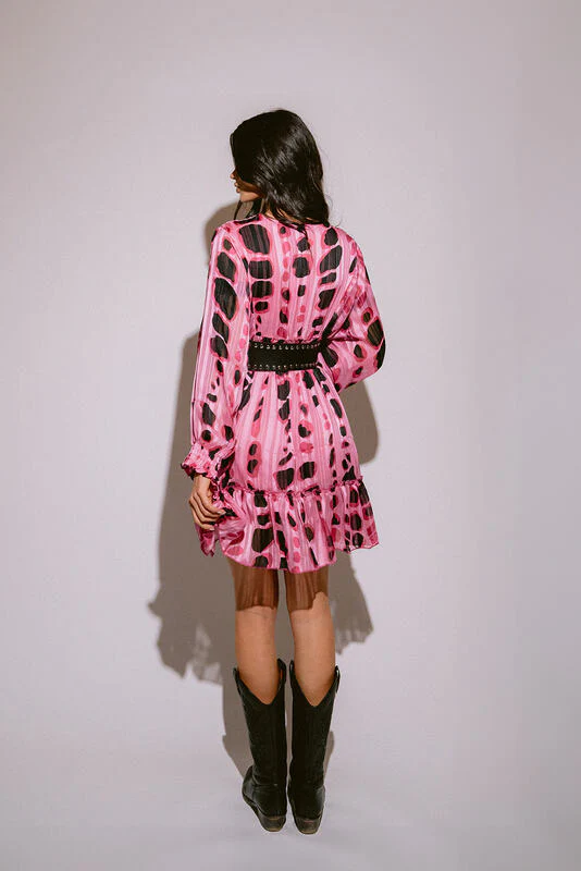 Atrévete a destacar con este vestido mini de estampado animal print, una fusión perfecta de audacia y feminidad. Sus tonos vibrantes en rosa y negro le dan un toque moderno, mientras que el escote en V y el corte con volantes crean un look romántico y favorecedor. Es la prenda ideal para la mujer que busca un estilo diferente y lleno de personalidad. Combínalo con botas o tacones para una ocasión especial, y siéntete única y a la moda.