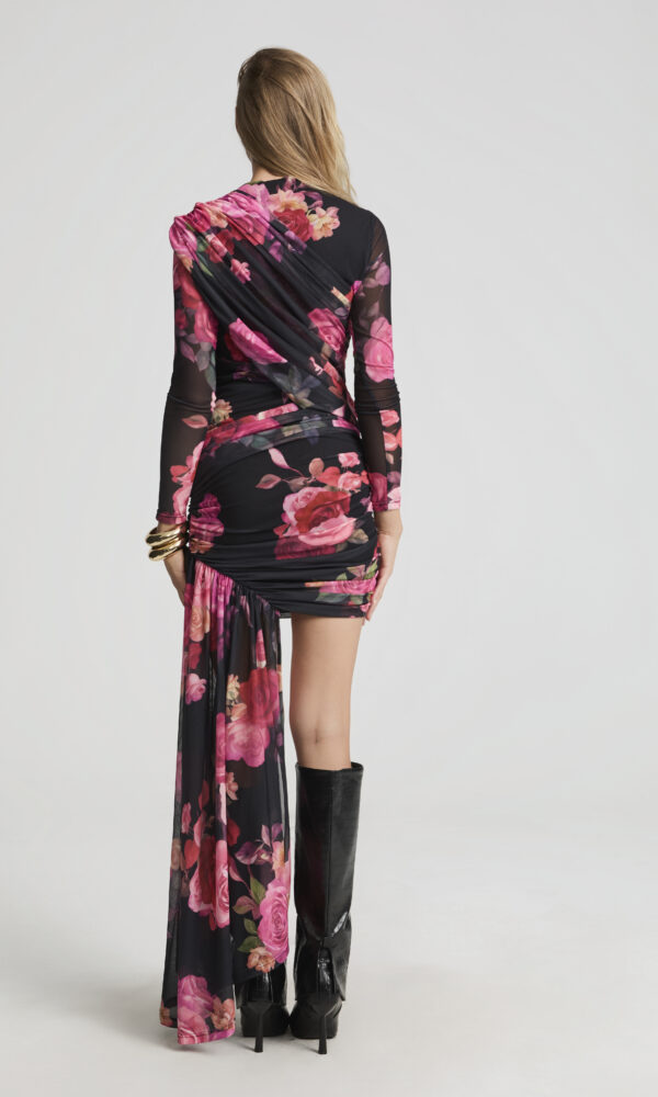 Vestido asimétrico floral con transparencias y drapeado, confeccionado en tul elástico con estampado floral en tonos rosas y fucsias. Su silueta asimétrica con caída lateral en gasa transparente aporta movimiento y un aire de alta costura. El cuerpo drapeado realza la figura y las mangas largas semitransparentes añaden elegancia. El fondo negro con flores intensas lo convierte en una elección ideal para eventos nocturnos o cenas sofisticadas. Perfecto con botas altas o sandalias de tacón.