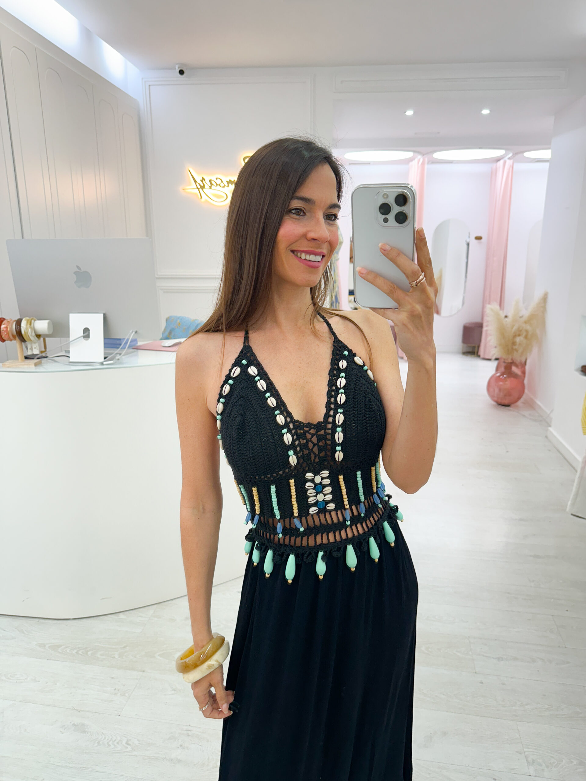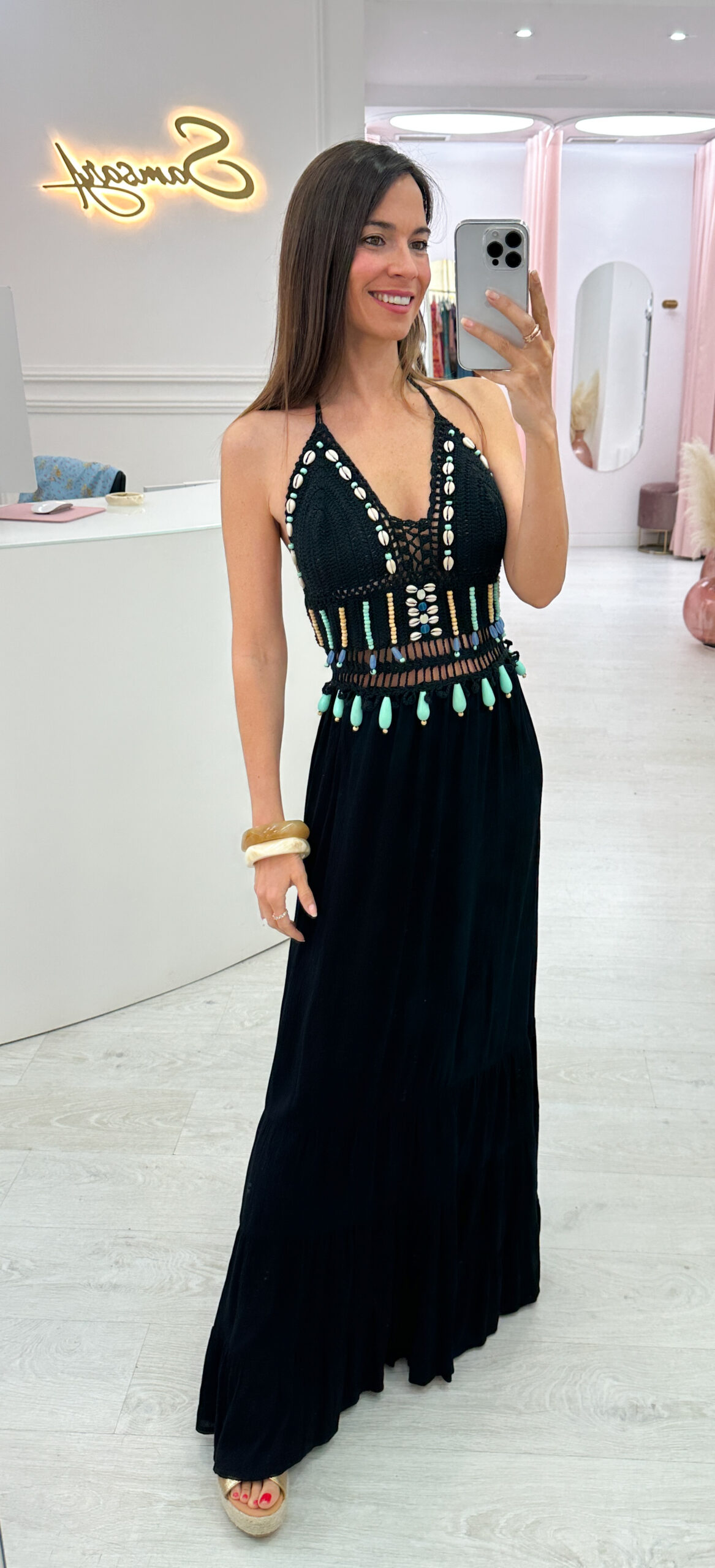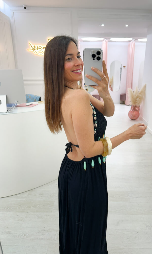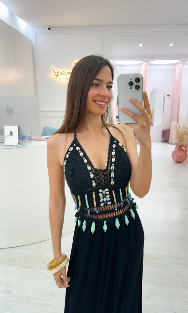 ¿Buscas el vestido perfecto para el verano? Este vestido largo de crochet es la combinación ideal entre artesanía y tendencia. El diseño presenta un top tejido a mano , muy tupido( por lo que no transparenta )con detalles de cuentas en turquesa, la zona de la falda es ligera , de viscosa ,que asegura frescura en los días más calurosos.