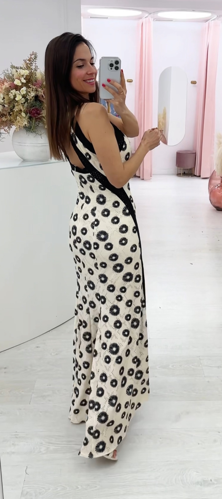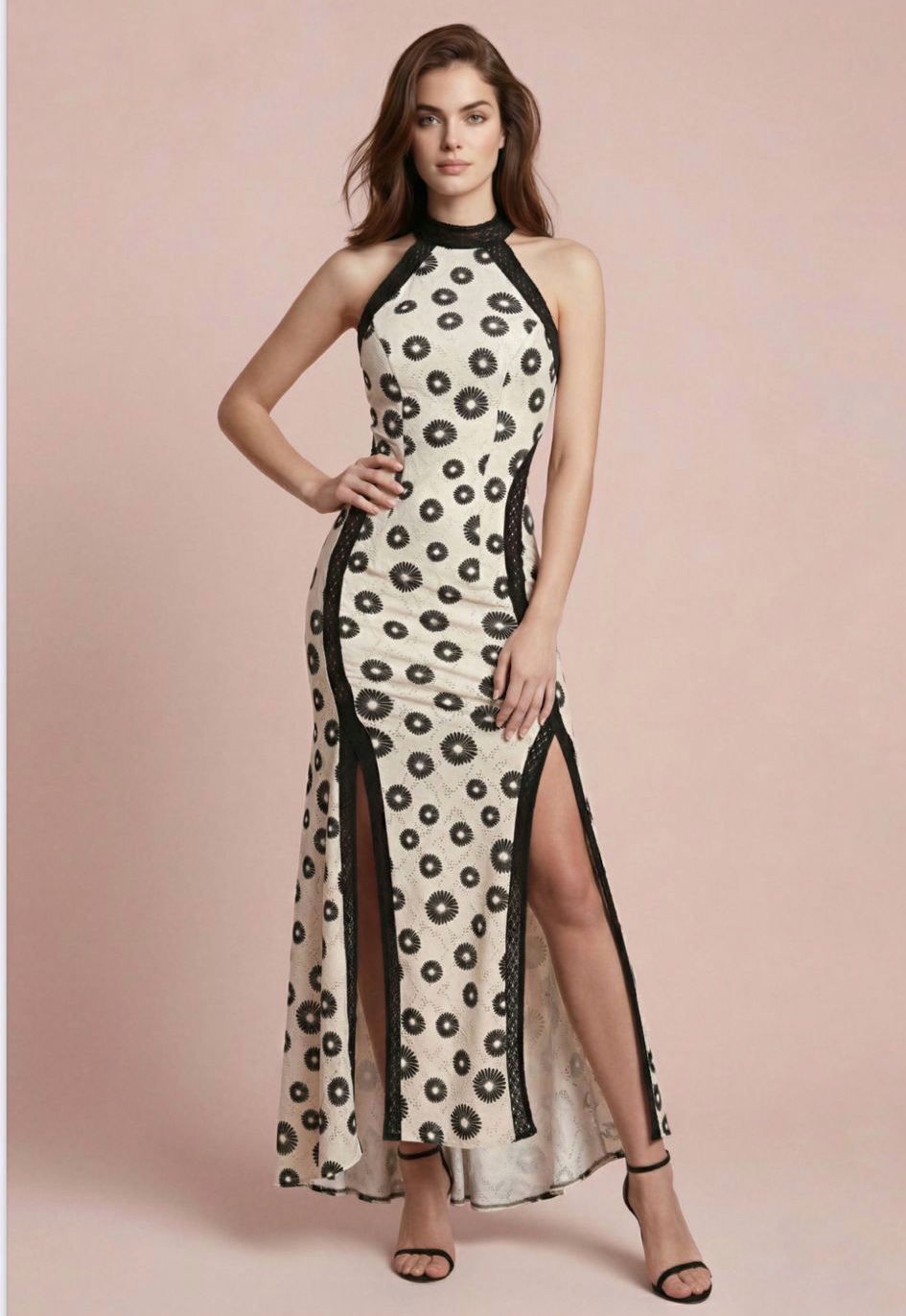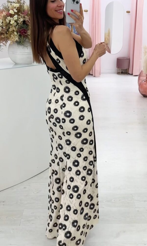 Vestido largo totalmente forrado con dos aberturas frontales. El tejido presenta un delicado estampado geométrico floral en tonos negros sobre fondo crudo, aportando un toque distintivo y atemporal. Las líneas laterales en contraste afinan la silueta, mientras que la abertura lateral añade movimiento, sensualidad y comodidad al caminar.