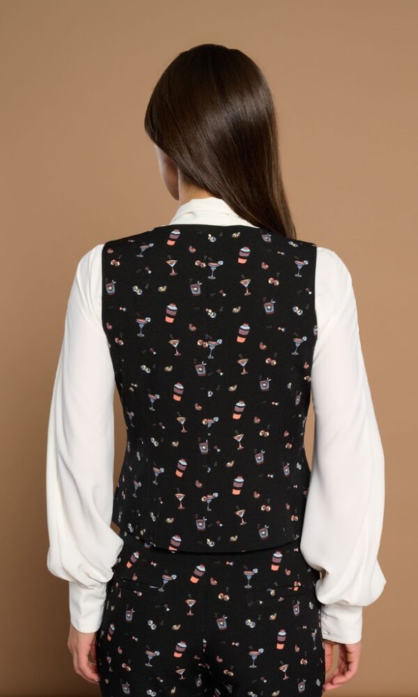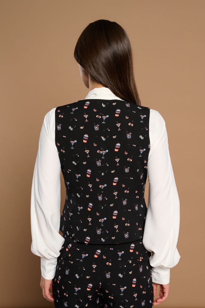 Chaleco estampado coctel. Escote pico y manga sisa. Falsos bolsillos de vivo delanteros. Cierre frontal con botones. Forro interior.